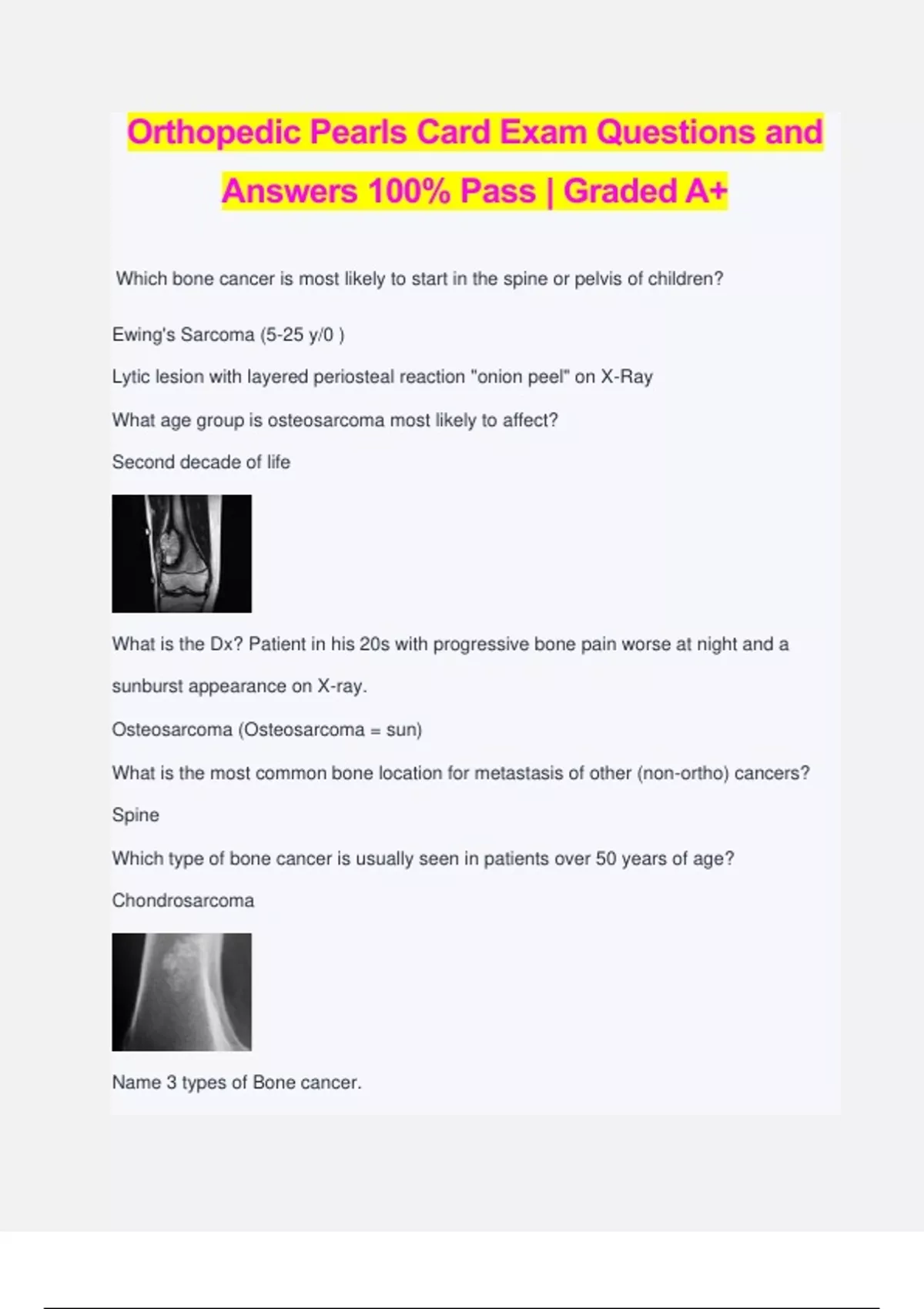 Orthopedic Pearls Card Exam Questions and Answers 100% Pass | Graded A+ Which bone cancer is most likely to start in the spine or pelvis of children? Ewing's Sarcoma (5-25 y/0 ) Lytic lesion with layered periosteal reaction "onion peel" on X-Ray What age group is osteosarcoma most likely to affect? Second decade of life What is the Dx? Patient in his 20s with progressive bone pain worse at night and a sunburst appearance on X-ray. Osteosarcoma (Osteosarcoma = sun) What is the most common bone location for metastasis of other (non-ortho) cancers? Spine Which type of bone cancer is usually seen in patients over 50 years of age? Chondrosarcoma Name 3 types of Bone cancer. Osteosarcoma - Chondrosarcoma - Ewings sarcoma What pathogen can cause septic arthritis in healthy sexually active young adults? Neisseria gonorrhoeae Treatment for osteomyelitis? Debridement - Blood and wound cultures - Antibiotics based on culture for 6 + weeks - Remove hardware if present What type of fracture places patient at risk for fat embolism? Long bone fracture What exam finding is pathognomonic for fat embolism? Petechial rash after long bone fracture Treatment for compartment syndrome with high compartment pressure of 35-40 mmHg? Fasciotomy What is the name for a 5th metatarsal diaphysis fracture? Jones Fracture 5 Ps to look for if compartment syndrome is suspected? Pain - Pallor - Pulselessness - Paresthesia - Paralysis Treatment for Achilles tendon rupture? Surgical repair What is the Dx? + Thompson test of the ankle patient can't stand on toes. Achilles tendon rupture Most common type of ankle sprain? Lateral sprain from inversion of the foot (Anterior talofibular ligament) What is the most likely injury with a + posterior draw and posterior sag sign? PCL injury/tear What is the most likely injury with a + anterior draw test of the knee? ACL injury/tear What is the most likely injury after a varus stress trauma to the knee? LCL injury What is the most likely injury with a + McMurray's test of the knee? Meniscal tear/injury What is the most likely injury with a + Lachman s test of the knee? ACL injury Treatment for Osgood-Schlatter? Conservative: Ice - NSAIDs - Protective pad over area Where is pain and swelling located with Osgood-Schlatter disease? Tibial tubercle/tuberosity (the point of insertion of patellar tendon) Should DVT prophylaxis be provided to all hip FX patients (unless contraindicated) after ORIF of the hip? Yes What is the Dx? Elderly patient after a fall with an externally rotated and shortened left leg. Left hip fracture Name 2 common risk factors for developing a hip fracture. Osteoporosis - Elderly