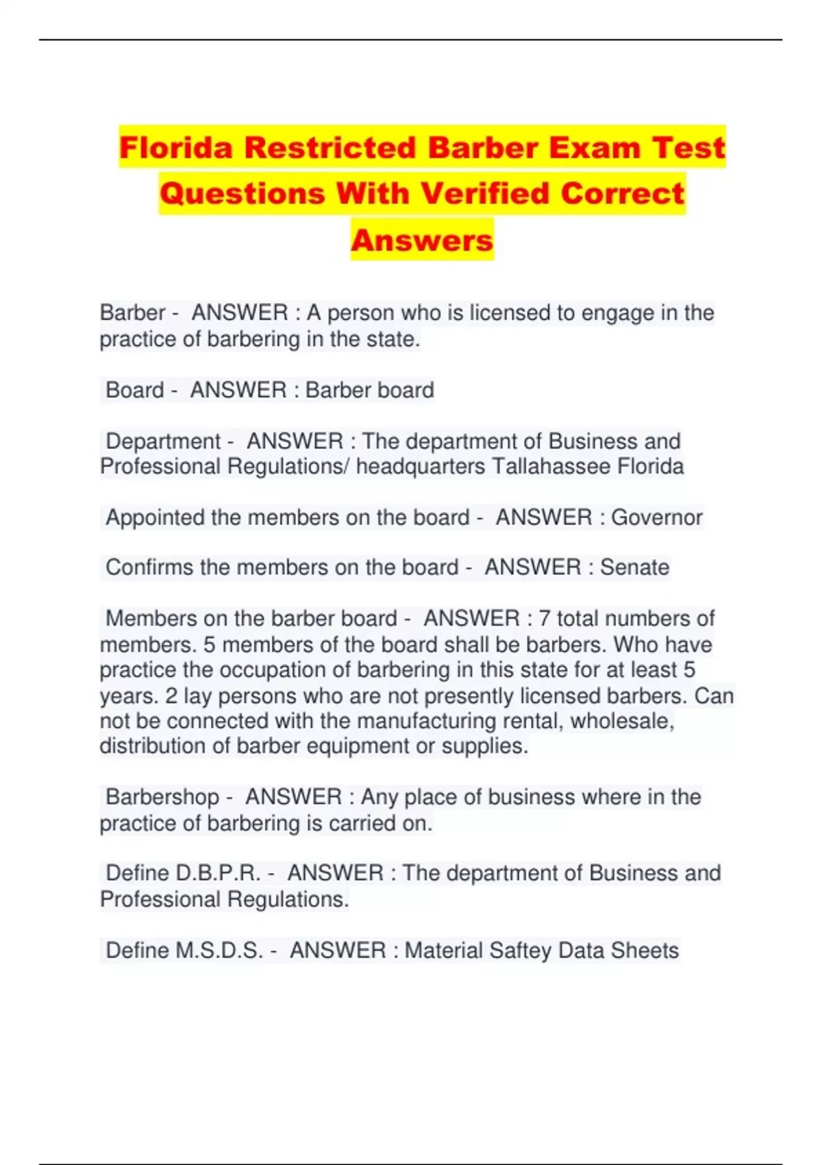 Florida Restricted Barber Exam Test Questions With Verified Correct Answers Barber - ANSWER : A person who is licensed to engage in the practice of barbering in the state. Board - ANSWER : Barber board Department - ANSWER : The department of Business and Professional Regulations/ headquarters Tallahassee Florida Appointed the members on the board - ANSWER : Governor Confirms the members on the board - ANSWER : Senate Members on the barber board - ANSWER : 7 total numbers of members. 5 members of the board shall be barbers. Who have practice the occupation of barbering in this state for at least 5 years. 2 lay persons who are not presently licensed barbers. Can not be connected with the manufacturing rental, wholesale, distribution of barber equipment or supplies. Barbershop - ANSWER : Any place of business where in the practice of barbering is carried on. Define D.B.P.R. - ANSWER : The department of Business and Professional Regulations.