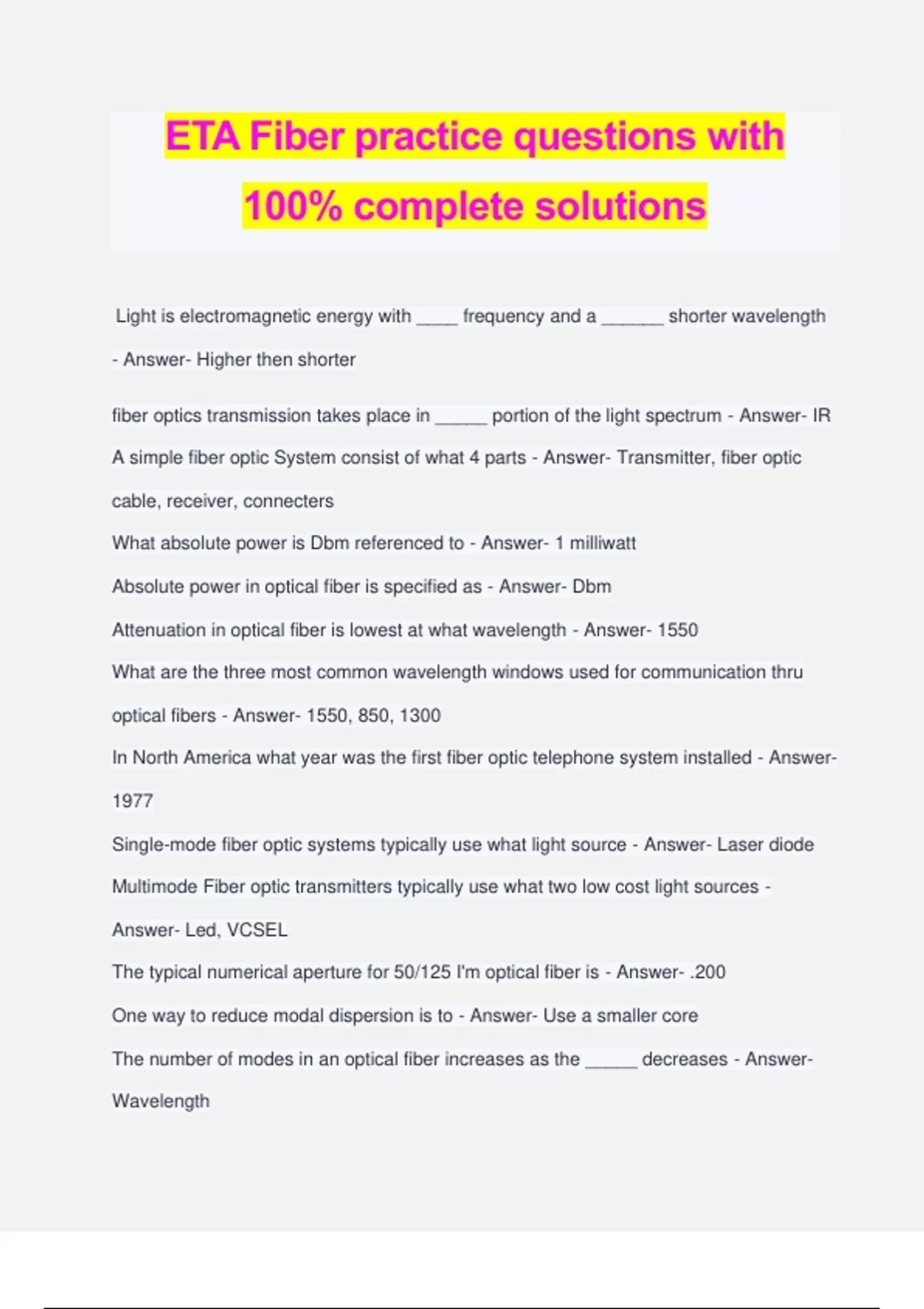 ETA Fiber practice questions with 100% complete solutions Light is electromagnetic energy with ____ frequency and a ______ shorter wavelength - Answer- Higher then shorter fiber optics transmission takes place in _____ portion of the light spectrum - Answer- IR A simple fiber optic System consist of what 4 parts - Answer- Transmitter, fiber optic cable, receiver, connecters What absolute power is Dbm referenced to - Answer- 1 milliwatt Absolute power in optical fiber is specified as - Answer- Dbm Attenuation in optical fiber is lowest at what wavelength - Answer- 1550 What are the three most common wavelength windows used for communication thru optical fibers - Answer- 1550, 850, 1300 In North America what year was the first fiber optic telephone system installed - Answer- 1977 Single-mode fiber optic systems typically use what light source - Answer- Laser diode Multimode Fiber optic transmitters typically use what two low cost light sources - Answer- Led, VCSEL The typical numerical aperture for 50/125 I'm optical fiber is - Answer- .200 One way to reduce modal dispersion is to - Answer- Use a smaller core The number of modes in an optical fiber increases as the _____ decreases - Answer- Wavelength What optical effect is produced by all mechanical interconnections whether mechanical splices or mated connected pairs - Answer- Fresnel Reflections When light passes from one transparent medium to anther transparent medium that has a different refractive index the light wave bends this is called ? - Answer- Refraction What part of the multimode optical fiber has the lowest refraction index - Answer- Cladding Single-mode fiber has a _____ core compared to multimode fiber - Answer- Smaller Single mode systems usually operate at what three wavelengths - Answer- 1625, 1550, 1310 What are the two most common multimode wavelengths - Answer- 859, 1300 Attenuation (loss) is specified as - Answer- DB What is a "mode" in optical fiber - Answer- A light path Improper bending of optical fiber will do what to tensile strength - Answer- Decrease OM3 and OM4 multimode fibers are commonly known as _________ fibers - Answer- Laser optimized