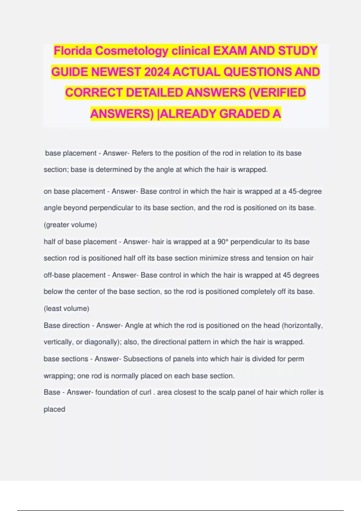 Florida Cosmetology clinical EXAM AND STUDY GUIDE NEWEST 2024 ACTUAL QUESTIONS AND CORRECT DETAILED ANSWERS (VERIFIED ANSWERS) |ALREADY GRADED A base placement - Answer- Refers to the position of the rod in relation to its base section; base is determined by the angle at which the hair is wrapped. on base placement - Answer- Base control in which the hair is wrapped at a 45-degree angle beyond perpendicular to its base section, and the rod is positioned on its base. (greater volume) half of base placement - Answer- hair is wrapped at a 90° perpendicular to its base section rod is positioned half off its base section minimize stress and tension on hair off-base placement - Answer- Base control in which the hair is wrapped at 45 degrees below the center of the base section, so the rod is positioned completely off its base. (least volume) Base direction - Answer- Angle at which the rod is positioned on the head (horizontally, vertically, or diagonally); also, the directional pattern in which the hair is wrapped. base sections - Answer- Subsections of panels into which hair is divided for perm wrapping; one rod is normally placed on each base section. Base - Answer- foundation of curl . area closest to the scalp panel of hair which roller is placed stem - Answer- between the base and first arch (turn) gives curl definition and mobility hair between scalp and the first turn of the roller circle - Answer- forms a complete circle the wave size of a curl will determine width/wave and strength No stem curl - Answer- (Betty boo) on base of curly , tight firm long lasting minimum mobility Half stem curl - Answer- Curl placed half off the base; permits medium movement and gives good control to the hair. full stem movement - Answer- greatest mobility placed completely of base near scalp will be flat and almost straight give hair strong define direction Exothermic - Answer- produces heat (alkaline) heats up waving solution Endothermic - Answer- Absorbs/require heat (acid) use hooded dryer (less damaging) ammonia-free waves - Answer- Perms that use an ingredient that does not evaporate as readily as ammonia, so there is very little odor associated with their use. thio-free waves - Answer- Perm that uses an ingredient other than ATG as the primary reducing agent, such as cysteamine or mercaptamine. (Still damaging ) low-pH waves - Answer- Perms that use sulfates, sulfites, and bisulfites as an alternative to ammonium thioglycolate (atg) they have a low pH. Weak don't provide strong curl hair density - Answer- The number of individual hair strands on 1 square inch of scalp. hair porosity - Answer- The ability of the hair to absorb moisture Hair elasticity - Answer- The ability of the hair to stretch and return to its original length Low porosity - Answer- When the cuticle is tight and the hair is resistant, it is difficult for moisture or chemicals to penetrate. What term describes this condition? High porosity - Answer- When the cuticle is lifted and the hair is overly porous and takes color quickly the hair would be said to have Average porosity - Answer- The cuticle is slightly raised. The hair is normal and processes in an average amount of time. (Normal) Curl rearranger - Answer- reduces peptide bonds so hair can relax and become straight; thio-based product (Thio based) (atg)