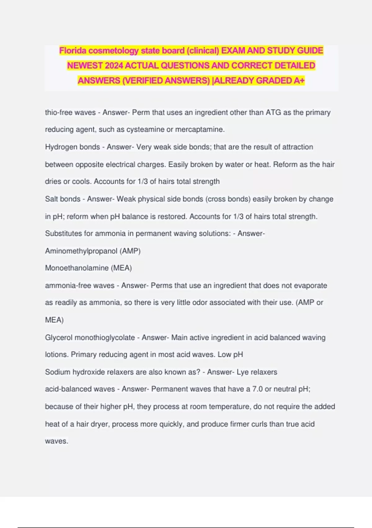 Florida cosmetology state board (clinical) EXAM AND STUDY GUIDE NEWEST 2024 ACTUAL QUESTIONS AND CORRECT DETAILED ANSWERS (VERIFIED ANSWERS) |ALREADY GRADED A+ thio-free waves - Answer- Perm that uses an ingredient other than ATG as the primary reducing agent, such as cysteamine or mercaptamine. Hydrogen bonds - Answer- Very weak side bonds; that are the result of attraction between opposite electrical charges. Easily broken by water or heat. Reform as the hair dries or cools. Accounts for 1/3 of hairs total strength Salt bonds - Answer- Weak physical side bonds (cross bonds) easily broken by change in pH; reform when pH balance is restored. Accounts for 1/3 of hairs total strength. Substitutes for ammonia in permanent waving solutions: - Answer- Aminomethylpropanol (AMP) Monoethanolamine (MEA) ammonia-free waves - Answer- Perms that use an ingredient that does not evaporate as readily as ammonia, so there is very little odor associated with their use. (AMP or MEA) Glycerol monothioglycolate - Answer- Main active ingredient in acid balanced waving lotions. Primary reducing agent in most acid waves. Low pH Sodium hydroxide relaxers are also known as? - Answer- Lye relaxers acid-balanced waves - Answer- Permanent waves that have a 7.0 or neutral pH; because of their higher pH, they process at room temperature, do not require the added heat of a hair dryer, process more quickly, and produce firmer curls than true acid waves. Side bonds - Answer- Disulfide, salt, and hydrogen bonds that cross-link polypeptide chains together. keratin proteins - Answer- Long, coiled polypeptide chains. Silicones - Answer- Special type of oil used in hair conditioners, water-resistant lubricants for the skin, and nail polish dryers. When a hydroxide relaxer breaks the disulfide bond converting them to lanthonine bonds.... - Answer- The bonds cannot be reformed with any other chemical treatment True acid waves - Answer- -Have a pH between 4.5-7.0 and require heat to process. -He process slower than alkaline waves -GMTG is the active ingredient pH level of Hydrogen Peroxide - Answer- 2.5-4.5