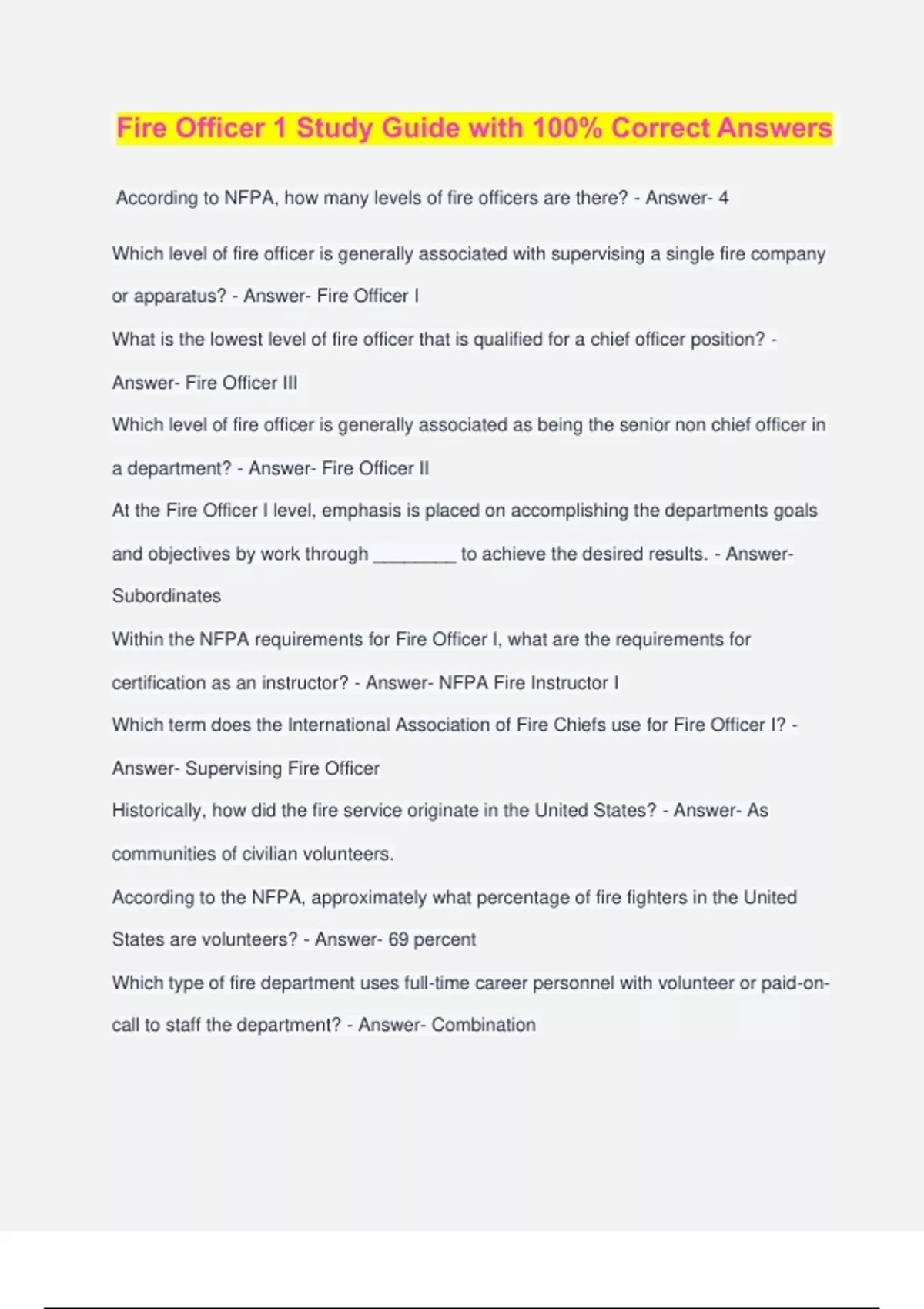 Fire Officer 1 Study Guide with 100% Correct Answers According to NFPA, how many levels of fire officers are there? - Answer- 4 Which level of fire officer is generally associated with supervising a single fire company or apparatus? - Answer- Fire Officer I What is the lowest level of fire officer that is qualified for a chief officer position? - Answer- Fire Officer III Which level of fire officer is generally associated as being the senior non chief officer in a department? - Answer- Fire Officer II At the Fire Officer I level, emphasis is placed on accomplishing the departments goals and objectives by work through ________ to achieve the desired results. - Answer- Subordinates Within the NFPA requirements for Fire Officer I, what are the requirements for certification as an instructor? - Answer- NFPA Fire Instructor I Which term does the International Association of Fire Chiefs use for Fire Officer I? - Answer- Supervising Fire Officer Historically, how did the fire service originate in the United States? - Answer- As communities of civilian volunteers. According to the NFPA, approximately what percentage of fire fighters in the United States are volunteers? - Answer- 69 percent Which type of fire department uses full-time career personnel with volunteer or paid-on- call to staff the department? - Answer- Combination Although there are four common forms of staffing fire department organizations, most discussions divide the fire fighters into which two categories? - Answer- Career and Volunteer Which type of organization do private industries or nongovernmental organizations use to provide fire protection for factories, processing plants, and large private facilities? - Answer- Brigades In 1871, two major fires occurred that would change the way the United States viewed and responded to fire. What was one of those fires? - Answer- The Great Chicago Fire When steam-powered fire engines were introduced in the 1800s, what was the reaction of many volunteer fire fighters? - Answer- Fire fighters were threatened by the apparatus and resisted their use. Which devices introduced in the 1850s enabled citizens to send a coded telegraph signal to the fire department dispatch center? - Answer- Public call boxes What was the first building codes originally developed to prevent? - Answer- Building collapse Which industry played a major role in the development of the first model building codes? - Answer- The insurance industry Despite the invention of technical firefighting equipment, what is the most important resource on a fire scene? - Answer- Fire fighters To which rank do fire fighters report directly? - Answer- Lieutenant Of the following chief officer titles, which is the lowest in rank? - Answer- Battalion chief Which level of administrative chief fire officer is responsible for managing the activities of several fire companies within a defined geographic area, usually in more than one fire station? - Answer- Battalion chief Who has the ultimate administrative responsibility in a fire department? - Answer- Fire chief Which condition could ensue if it were not for the principle of unity of command? - Answer- Fire fighters could receive multiple, possibly conflicting, orders from different officers. Most experts believe that span of control should extend to no more than _______ people. - Answer- 5 With _______, the specific assignment of a task to an individual makes that person responsible for completing the task and prevents duplication of job assignments. - Answer- Division of labor What is the general term for guidelines that a department establishes for fire fighters? - Answer- Discipline All of the following are common ways of organizing a fire department except one. Choose the exception. - Answer- Demographics