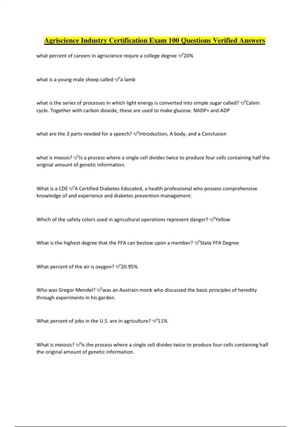 Agriscience Industry Certification Exam 100 Questions Verified Answers what percent of careers in agriscience requre a college degree 20% what is a young male sheep called a lamb what is the series of processes in which light energy is converted into simple sugar called? Calvin cycle. Together with carbon dioxide, these are used to make glucose. NADP+ and ADP what are the 3 parts needed for a speech? Introduction, A body, and a Conclusion what is meosis? Is a process where a single cell divides twice to produce four cells containing half the original amount of genetic information. What is a CDE A Certified Diabetes Educated, a health professional who possess comprehensive knowledge of and experience and diabetes prevention management. Which of the safety colors used in agricultural operations represent danger? Yellow What is the highest degree that the FFA can bestow upon a member? State FFA Degree What percent of the air is oxygen? 20.95% Who was Gregor Mendel? was an Austrain monk who discussed the basic principles of heredity through experiments in his garden. What percent of jobs in the U.S. are in agriculture? 11% What is meiosis? Is the process where a single cell divides twice to produce four cells containing half the original amount of genetic information. What is mitosis? a part of the cell cycle when replicated chromosomes are separated into two new nuclei What is a young male chicken called? a rooster what is is a young female chicken called? a hen What are young male cattle called? bull what are young female cattle called heifer what are mature male swine called a hog What is a young female horse called? Filly what is a newborn horse called foal what is a newborn goat called kid what are newborn swine called piglet what is a newborn sheep called lamb what is the term when sheep are giving birth lambing what is the term when swine are giving birth farrowing what is the term when chickens are giving birth laying what is a mature female chicken called hen what is a mature female horse called mare what is paraliamentary procedure using well-defined to conduct business through formal orginized