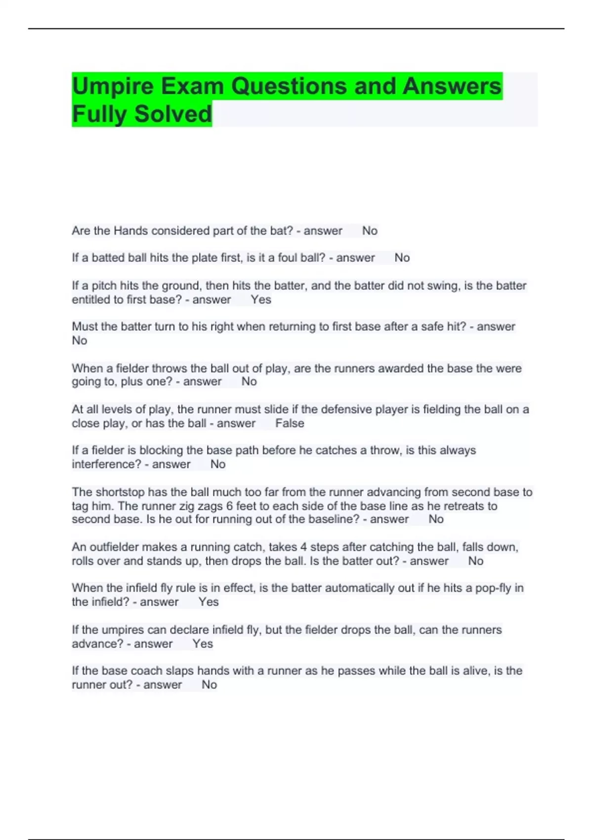 Umpire Exam Questions and Answers Fully Solved Are the Hands considered part of the bat? No If a batted ball hits the plate first, is it a foul ball? No If a pitch hits the ground, then hits the batter, and the batter did not swing, is the batter entitled to first base? Yes Must the batter turn to his right when returning to first base after a safe hit? No When a fielder throws the ball out of play, are the runners awarded the base the were going to, plus one? No At all levels of play, the runner must slide if the defensive player is fielding the ball on a close play, or has the ball False If a fielder is blocking the base path before he catches a throw, is this always interference? No The shortstop has the ball much too far from the runner advancing from second base to tag him. The runner zig zags 6 feet to each side of the base line as he retreats to second base. Is he out for running out of the baseline? No An outfielder makes a running catch, takes 4 steps after catching the ball, falls down, rolls over and stands up, then drops the ball. Is the batter out? No When the infield fly rule is in effect, is the batter automatically out if he hits a pop-fly in the infield? Yes If the umpires can declare infield fly, but the fielder drops the ball, can the runners advance? Yes If the base coach slaps hands with a runner as he passes while the ball is alive, is the runner out? No As the batter rounds third after hitting a homerun, his teammates hug him and pat him on the back, should the runner be called out? No Runner advances a base on a pitch that was tipped by the batter and caught by the catcher, must the runner return to his original base? No In little league, may a coach or manager warm up the pitcher before the game starts? No In little league, must the catcher wear a helmet during pregame practice? Yes Two out, runners on first and second base. Batter hits single, runner on second scores, runner on first base missed second but reaches third. The defense properly appeals that missed second. Does the run count? No Bases full, two out, batter walks. Catcher throws ball to first baseman, ball gets by him into right field. All runners on base score with the batter reaching second. The defense appeals that the batter-runner missed first. The umpire agrees and calls him out. How many runs score? 0 Runner goes far out of the base line to avoid a fielder trying to field a fair-batted ball. Umpire declares the runner out. Wrong One out, runners on first and second. Batter hits a pop fly between third and home, the umpire calls "infield fly if fair," the fielder under the ball, lets the ball strike the ground untouched in foul territory, the ball then then rolls into fair territory. The umpire rules an infield fly and declares the batter out. Right Runners on second and third, two out, batter hits a clean double and is thrown out attempting to stretch it into a triple. However, the runner who started on second left before the ball reached the plate. How many runs count? None Runner going from second to third bumps into the shortstop who was standing in the base path without the ball. The third baseman, who fielded the ball, comes over and tags the runner with the ball. Is the runner out? No A batter with two strikes is hit on fist while swinging at the pitch. Is he out? He is out The player listed third in the batting order bats when the number two batter should have been up. He gets a double. The defense appeals that he was the wrong batter. The umpire calls number two out and puts number three up to bat. Right There is no limit on the number of pitchers used in a game True A pitcher in the majors removed from the mound can return to pitch later in the game False A 14 year old throws 20 pitches in a game. He can pitch the next day True A 12 year old throws 51-65 pitches in a game. He will need at least 3-calender days rest True If a pitcher reaches a day of rest threshold while facing a batter, the pitcher will be required to observe the calendar days of rest for the threshold reached if they complete that at-bat True Any player who has played the position of catcher in 4 or more innings is not eligible to pitch on that calendar day True