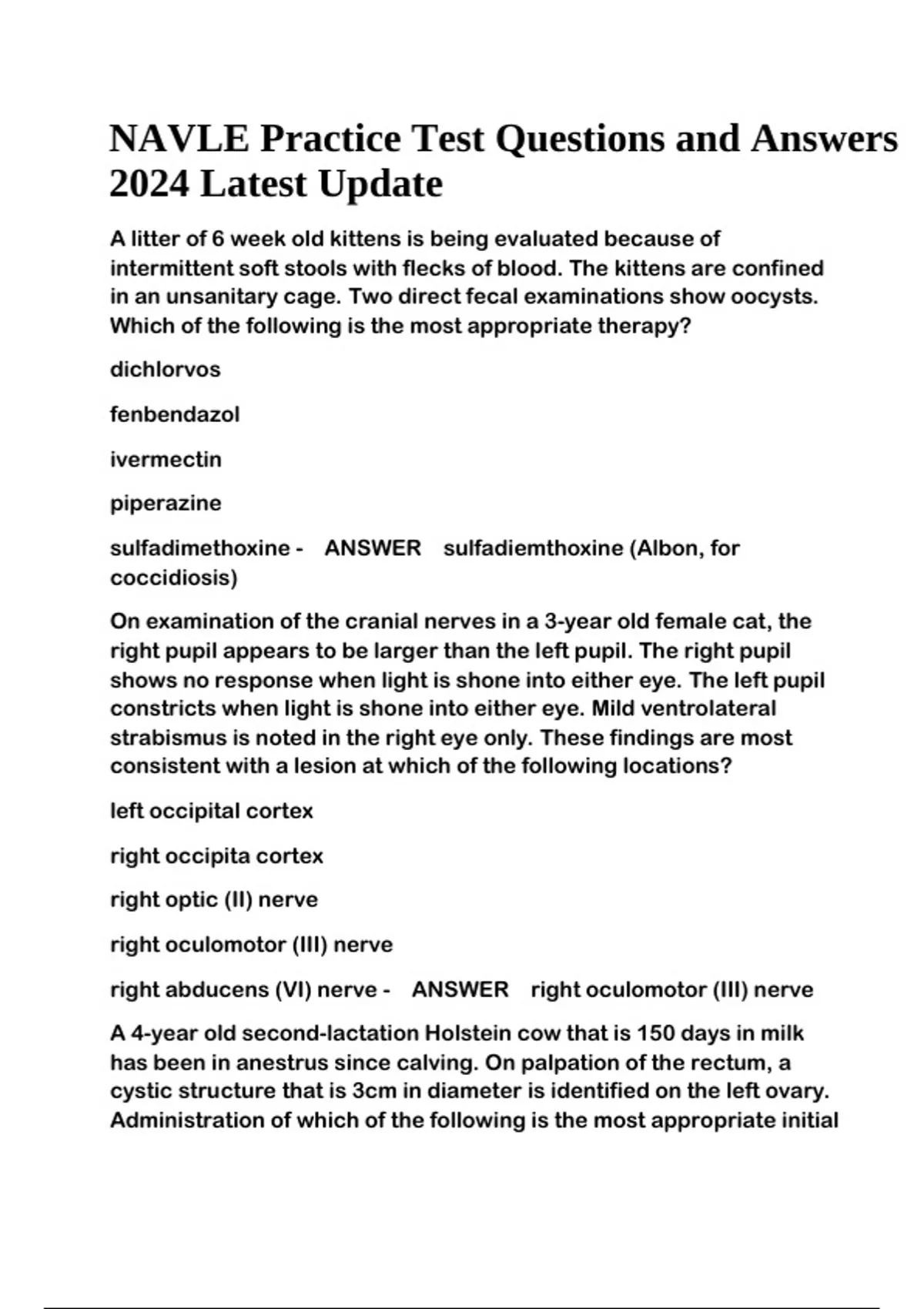 NAVLE Practice Test Questions and Answers 2024 Latest Update. A litter of 6 week old kittens is being evaluated because of intermittent soft stools with flecks of blood. The kittens are confined in an unsanitary cage. Two direct fecal examinations show oocysts. Which of the following is the most appropriate therapy? dichlorvos fenbendazol ivermectin piperazine sulfadimethoxine - ANSWER sulfadiemthoxine (Albon, for coccidiosis) On examination of the cranial nerves in a 3-year old female cat, the right pupil appears to be larger than the left pupil. The right pupil shows no response when light is shone into either eye. The left pupil constricts when light is shone into either eye. Mild ventrolateral strabismus is noted in the right eye only. These findings are most consistent with a lesion at which of the following locations? left occipital cortex right occipita cortex right optic (II) nerve right oculomotor (III) nerve right abducens (VI) nerve - ANSWER right oculomotor (III) nerve A 4-year old second-lactation Holstein cow that is 150 days in milk has been in anestrus since calving. On palpation of the rectum, a cystic structure that is 3cm in diameter is identified on the left ovary. Administration of which of the following is the most appropriate initial NAVLE Practice Test Questions and Answers 2024 Latest Update treatment? Follicle-stimulating hormone followed by gonadotropin-releasing hormone in 15 days Gonadotropin-releasing hormone followed by prostaglandin in 15 days Melengesterol acetate followed by prostaglandin in 19 days Prostaglandin followed by melengestrol acetate in 19 days - ANSWER Gonadotropin-releasing hormone followed by prostaglandin in 15 days A 10-year-old commercial beef cow has had a gradually diminished appetite and progressive weight loss over the past two months. Feces are dry and scanty. She continues to drink water. Physical examination shows distention of the left paralumbar fossa and ventral right abdominal wall. On rectal palpation, the rumen is full of firm ingesta and the ventral sac extends to the right of midline (L-shaped). Which of the following is the most appropriate next step? Administration of bisthmuth subsalicylate with sucrose Administraiton of magnesium hydroxide Exploratory laparotomy Salvage to slaughter Surgical creation of a rumen fistual - ANSWER Salvage to slaughter Fifteen percent to 20% of feedlot heifers that recently arrived from several auction markets are anorectic. Physical examination of the heifers shows serous nasal and ocular discharge, short explosive cough, and hyperemia of nasal mucosa. Which of the following is the most likely diagnosis? Atypical interstitial pneumonia Infectious bovine rhinotracheitis Mucosal disease Pasturellosis Mycoplasmosis - ANSWER Infectious bovine rhinotracheitis A group of 1000 5-week-old pigs has experienced a 2% death loss since weaning two weeks ago. most of the deaths were sudden; however, approximately 3% of the pigs showed clinical signs of lethargy, lameness, and labored breathing before dying. Postmortem examination of an affected pig shows severe fibrinous pleuritis, pericarditis, and peritonitis. Which of the following is the most likely causal organism? Arcanobacterium suis Escheria coli Haemophilus parasuis Salmonella cholerasuis Streptococcus suis - ANSWER Haemophilus parasuis A 9-week-old Rottweiler-mix puppy is beign evaluated because of an itchy rash around the lips and eyelids. Temperature is 103.3*F. Physical examination shows swellign of the muzzle, pruritic, exudative pustiles around the lips and eyelids, and swelling of the submandibular lymph nodes bilaterally. Which of the following is the most appropriate treatment? Cephalexin and prednisone Clindamycin and carprofen Enrofloxcin and etodolac Topical amitraz Topical betamethasone - ANSWER Cephalexin and prednisone A 5-year old Simmental cow who is used as a donor for embryo transfer is evaluated because of the acute onset of anorexia and lethargy. She has been flushed six times; the most recent flushing occured 10 days ago. Rectal temperature is 104*F . During PE, the cow is reluctant to move and periodically kicks at her abdomen. On rectal palpation, the left kidney is grossly enlarged and has a smooth texture. When stimulated to urinate, the urine is grossly hematuric; numerous blood clots and fibrin are present. Which of the following is the most appropriate treatment? Administration of gentamicin intravenously Administration of procaine penicillin G intramuscularly Long-term catheterization of the bladder Surgical removal of the enlarged kidney No treatment is indicated - ANSWER Administration of procaine penicillin G intramuscularly .