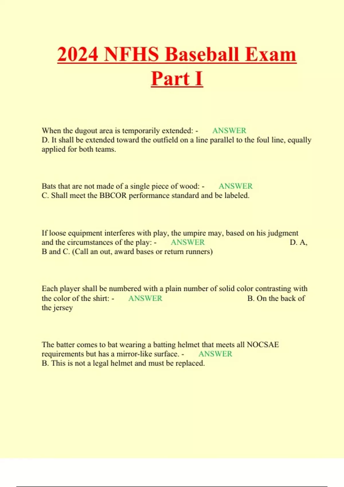 2024 NFHS Baseball Exam Part I When the dugout area is temporarily extended: - ANSWER D. It shall be extended toward the outfield on a line parallel to the foul line, equally applied for both teams. Bats that are not made of a single piece of wood: - ANSWER C. Shall meet the BBCOR performance standard and be labeled.