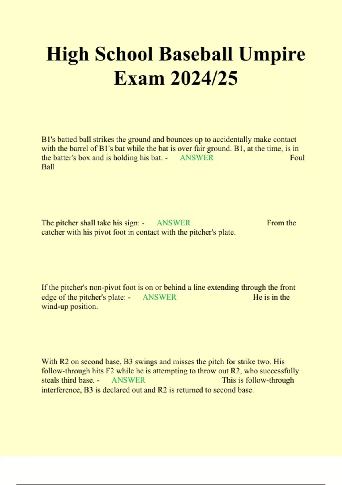 High School Baseball Umpire Exam 2024/25 B1's batted ball strikes the ground and bounces up to accidentally make contact with the barrel of B1's bat while the bat is over fair ground. B1, at the time, is in the batter's box and is holding his bat. - ANSWER Foul Ball The pitcher shall take his sign: - ANSWER From the catcher with his pivot foot in contact with the pitcher's plate. If the pitcher's non-pivot foot is on or behind a line extending through the front edge of the pitcher's plate: - ANSWER He is in the wind-up position. With R2 on second base, B3 swings and misses the pitch for strike two. His follow-through hits F2 while he is attempting to throw out R2, who successfully steals third base. - ANSWER This is follow-through interference, B3 is declared out and R2 is returned to second base.