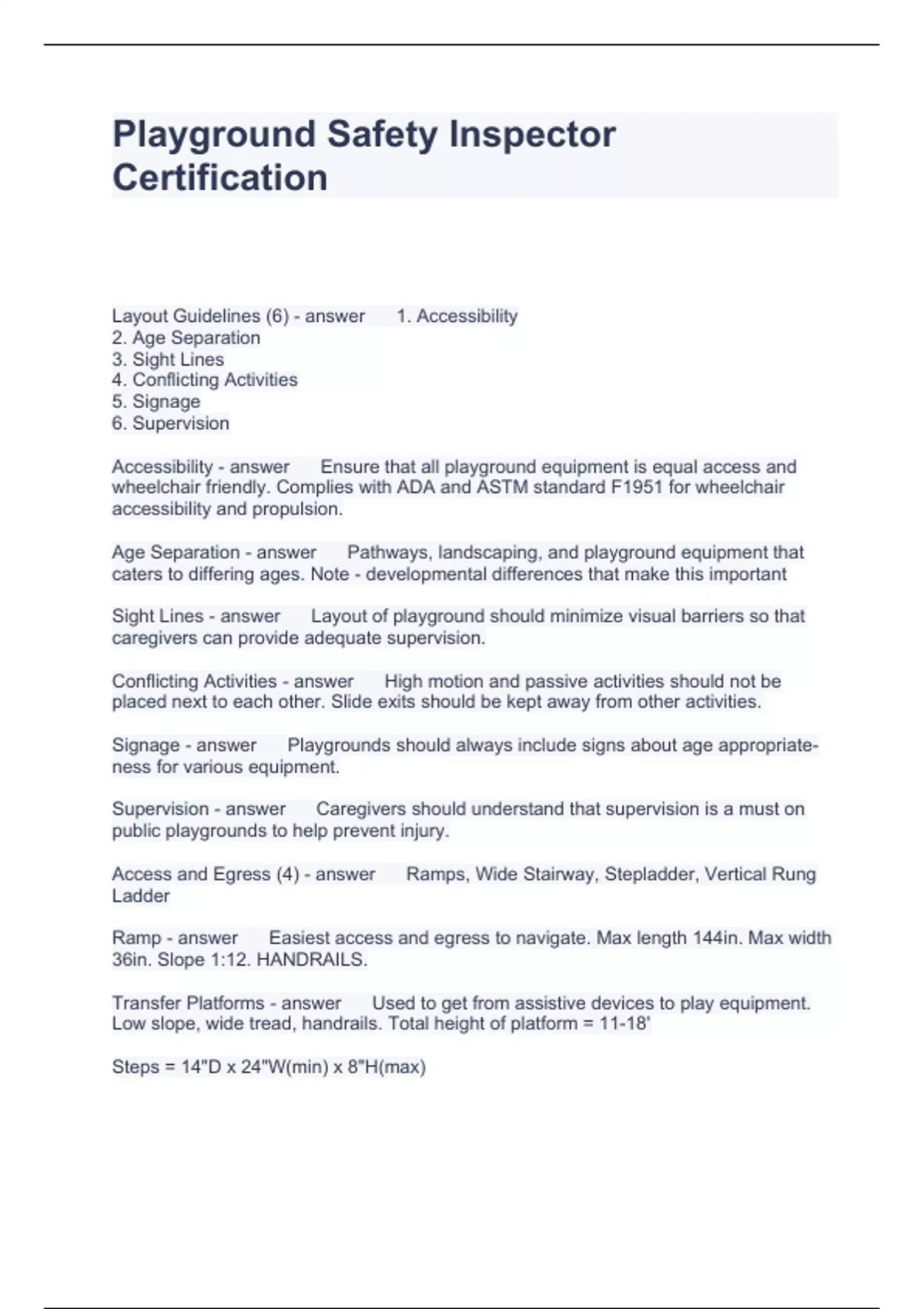 Playground Safety Inspector Certification Questions with Accurate Answers 2024