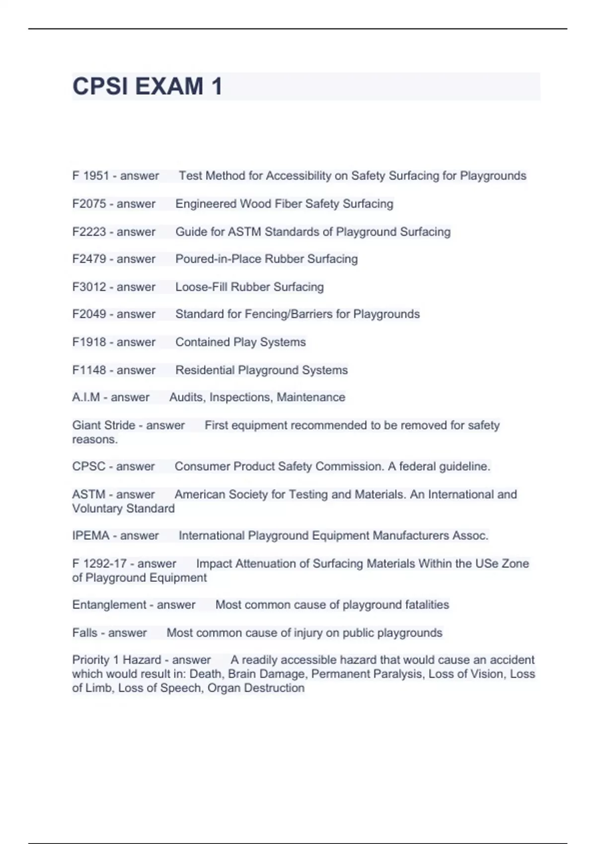 Exam of 7 pages for the course CPSI - Certified Playground Safety Inspector at CPSI - Certified Playground Safety Inspector (CPSI EXAM 1)