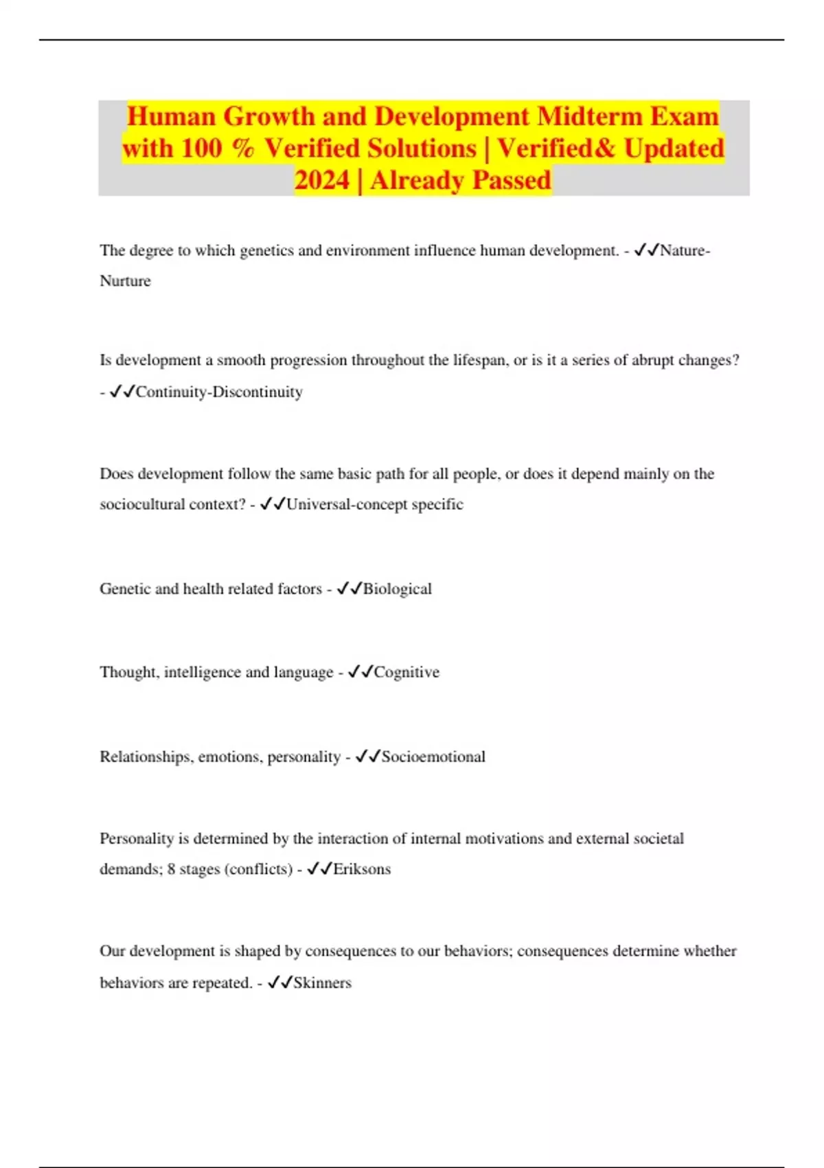 Human Growth and Development Midterm Exam with 100 % Verified Solutions | Verified& Updated 2024 | Already Passed