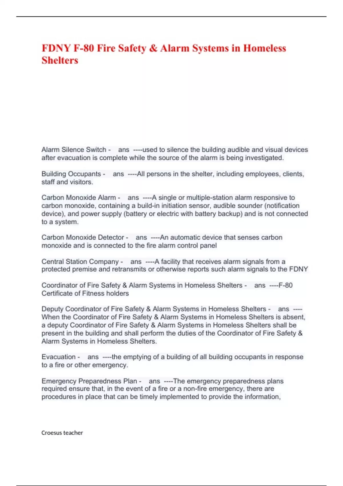 Alarm Silence Switch - ans ----used to silence the building audible and visual devices after evacuation is complete while the source of the alarm is being investigated. Building Occupants - ans ----All persons in the shelter, including employees, clients, staff and visitors. Carbon Monoxide Alarm - ans ----A single or multiple-station alarm responsive to carbon monoxide, containing a build-in initiation sensor, audible sounder (notification device), and power supply (battery or electric with battery backup) and is not connected to a system. Carbon Monoxide Detector - ans ----An automatic device that senses carbon monoxide and is connected to the fire alarm control panel Central Station Company - ans ----A facility that receives alarm signals from a protected premise and retransmits or otherwise reports such alarm signals to the FDNY Coordinator of Fire Safety & Alarm Systems in Homeless Shelters - ans ----F-80 Certificate of Fitness holders Deputy Coordinator of Fire Safety & Alarm Systems in Homeless Shelters - ans ----When the Coordinator of Fire Safety & Alarm Systems in Homeless Shelters is absent, a deputy Coordinator of Fire Safety & Alarm Systems in Homeless Shelters shall be present in the building and shall perform the duties of the Coordinator of Fire Safety & Alarm Systems in Homeless Shelters. Evacuation - ans ----the emptying of a building of all building occupants in response to a fire or other emergency. Emergency Preparedness Plan - ans ----The emergency preparedness plans required ensure that, in the event of a fire or a non-fire emergency, there are procedures in place that can be timely implemented to provide the information,