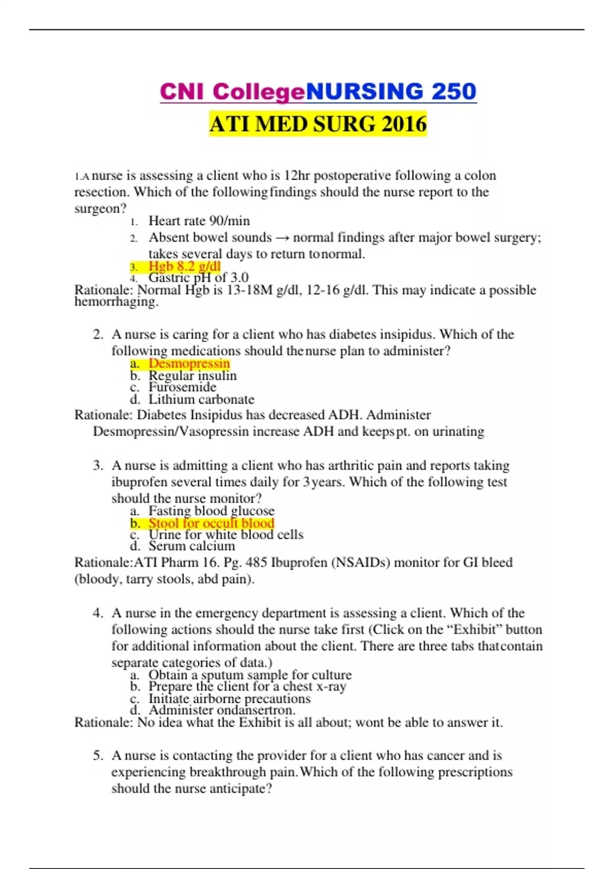 1.A nurse is assessing a client who is 12hr postoperative following a colon resection. Which of the followingfindings should the nurse report to the surgeon? 1. Heart rate 90/min 2. Absent bowel sounds → normal findings after major bowel surgery; takes several days to return tonormal. 3. Hgb 8.2 g/dl 4. Gastric pH of 3.0 Rationale: Normal Hgb is 13-18M g/dl, 12-16 g/dl. This may indicate a possible hemorrhaging. 2. A nurse is caring for a client who has diabetes insipidus. Which of the following medications should thenurse plan to administer? a. Desmopressin b. Regular insulin c. Furosemide d. Lithium carbonate Rationale: Diabetes Insipidus has decreased ADH. Administer Desmopressin/Vasopressin increase ADH and keepspt. on urinating 3. A nurse is admitting a client who has arthritic pain and reports taking ibuprofen several times daily for 3years. Which of the following test should the nurse monitor? a. Fasting blood glucose b. Stool for occult blood c. Urine for white blood cells d. Serum calcium
