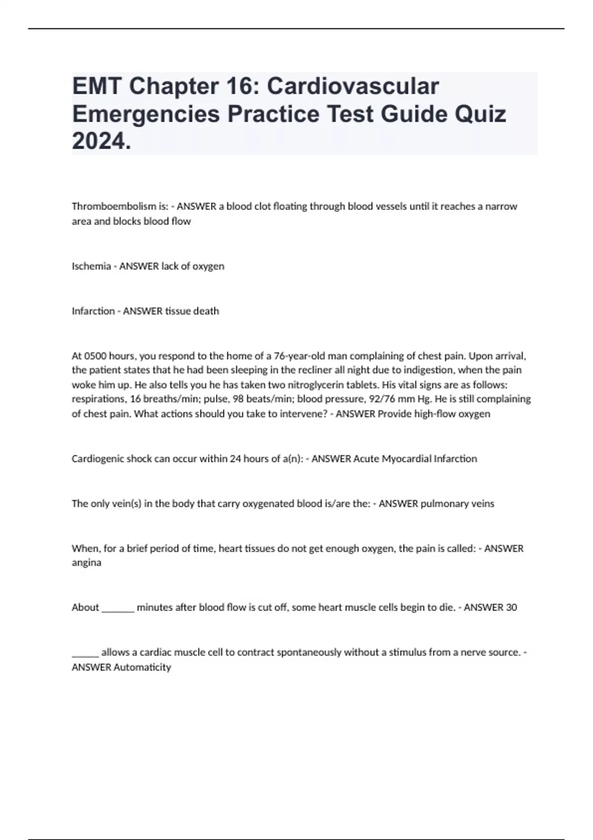 EMT Chapter 16: Cardiovascular Emergencies Practice Test Guide Quiz 2024.
