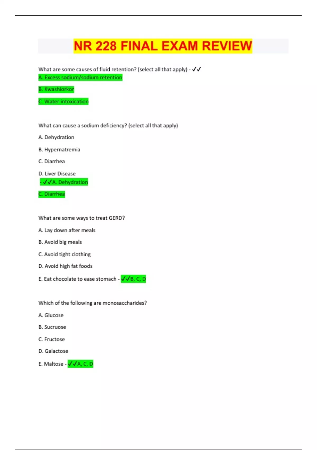 NR 228 FINAL EXAM REVIEW What are some causes of fluid retention? (select all that apply) - A. Excess sodium/sodium retention B. Kwashiorkor C. Water intoxication What can cause a sodium deficiency? (select all that apply) A. Dehydration B. Hypernatremia C. Diarrhea D. Liver Disease - A. Dehydration C. Diarrhea What are some ways to treat GERD? A. Lay down after meals B. Avoid big meals C. Avoid tight clothing D. Avoid high fat foods E. Eat chocolate to ease stomach - B, C, D Which of the following are monosaccharides? A. Glucose B. Sucruose C. Fructose D. Galactose E. Maltose - A, C, D