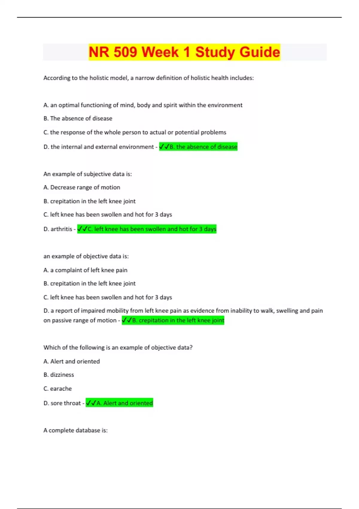 According to the holistic model, a narrow definition of holistic health includes: A. an optimal functioning of mind, body and spirit within the environment B. The absence of disease C. the response of the whole person to actual or potential problems D. the internal and external environment - B. the absence of disease An example of subjective data is: A. Decrease range of motion B. crepitation in the left knee joint C. left knee has been swollen and hot for 3 days D. arthritis - C. left knee has been swollen and hot for 3 days an example of objective data is: A. a complaint of left knee pain B. crepitation in the left knee joint C. left knee has been swollen and hot for 3 days D. a report of impaired mobility from left knee pain as evidence from inability to walk, swelling and pain on passive range of motion - B. crepitation in the left knee joint Which of the following is an example of objective data? A. Alert and oriented B. dizziness C. earache D. sore throat - A. Alert and oriented