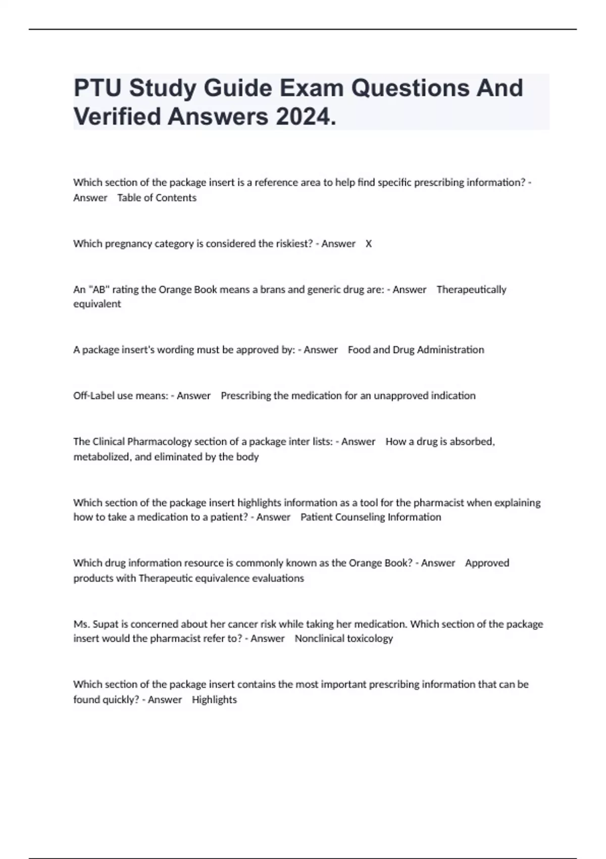 Which section of the package insert is a reference area to help find specific prescribing information? - Answer Table of Contents Which pregnancy category is considered the riskiest? - Answer X An "AB" rating the Orange Book means a brans and generic drug are: - Answer Therapeutically equivalent A package insert's wording must be approved by: - Answer Food and Drug Administration Off-Label use means: - Answer Prescribing the medication for an unapproved indication The Clinical Pharmacology section of a package inter lists: - Answer How a drug is absorbed, metabolized, and eliminated by the body Which section of the package insert highlights information as a tool for the pharmacist when explaining how to take a medication to a patient? - Answer Patient Counseling Information Which drug information resource is commonly known as the Orange Book? - Answer Approved products with Therapeutic equivalence evaluations Ms. Supat is concerned about her cancer risk while taking her medication. Which section of the package insert would the pharmacist refer to? - Answer Nonclinical toxicology Which section of the package insert contains the most important prescribing information that can be found quickly? - Answer Highlights