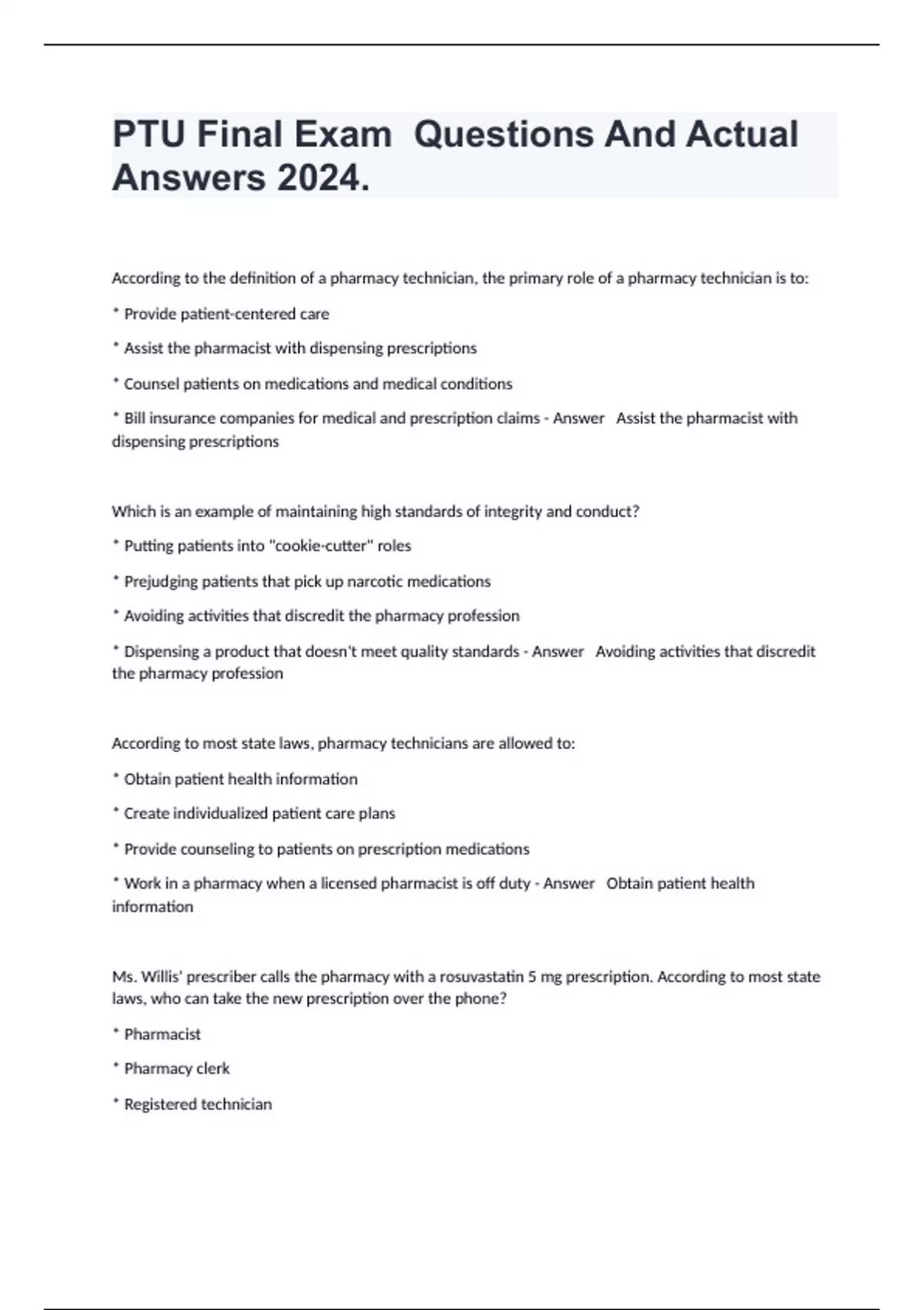 According to the definition of a pharmacy technician, the primary role of a pharmacy technician is to: * Provide patient-centered care * Assist the pharmacist with dispensing prescriptions * Counsel patients on medications and medical conditions * Bill insurance companies for medical and prescription claims - Answer Assist the pharmacist with dispensing prescriptions Which is an example of maintaining high standards of integrity and conduct? * Putting patients into "cookie-cutter" roles * Prejudging patients that pick up narcotic medications * Avoiding activities that discredit the pharmacy profession * Dispensing a product that doesn't meet quality standards - Answer Avoiding activities that discredit the pharmacy profession According to most state laws, pharmacy technicians are allowed to: * Obtain patient health information * Create individualized patient care plans * Provide counseling to patients on prescription medications * Work in a pharmacy when a licensed pharmacist is off duty - Answer Obtain patient health information Ms. Willis' prescriber calls the pharmacy with a rosuvastatin 5 mg prescription. According to most state laws, who can take the new prescription over the phone? * Pharmacist * Pharmacy clerk * Registered technician
