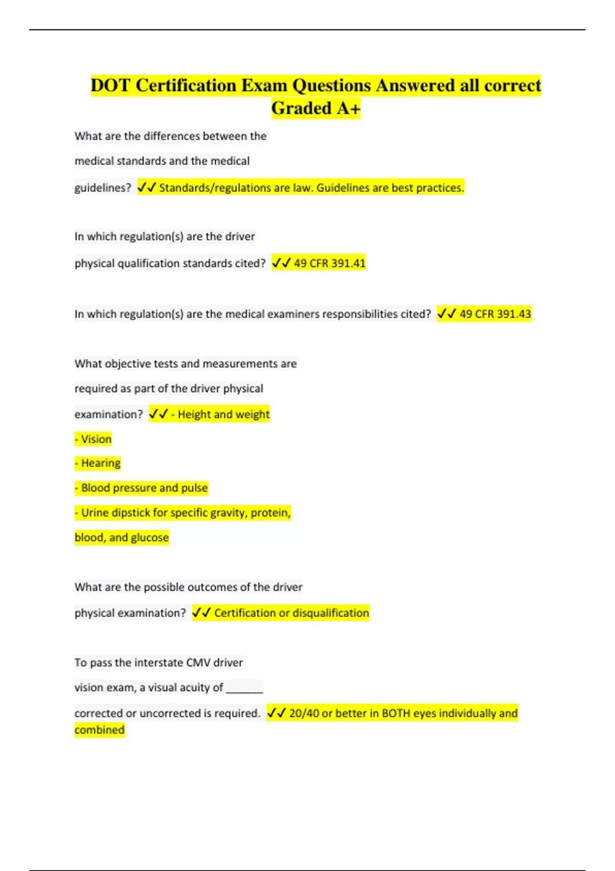 DOT Certification Exam Questions Answered all correct Graded A+ What are the differences between the medical standards and the medical guidelines? Standards/regulations are law. Guidelines are best practices. In which regulation(s) are the driver physical qualification standards cited? 49 CFR 391.41 In which regulation(s) are the medical examiners responsibilities cited? 49 CFR 391.43 What objective tests and measurements are required as part of the driver physical examination? - Height and weight - Vision - Hearing - Blood pressure and pulse - Urine dipstick for specific gravity, protein, blood, and glucose What are the possible outcomes of the driver physical examination? Certification or disqualification To pass the interstate CMV driver vision exam, a visual acuity of ______ corrected or uncorrected is required. 20/40 or better in BOTH eyes individually and combined