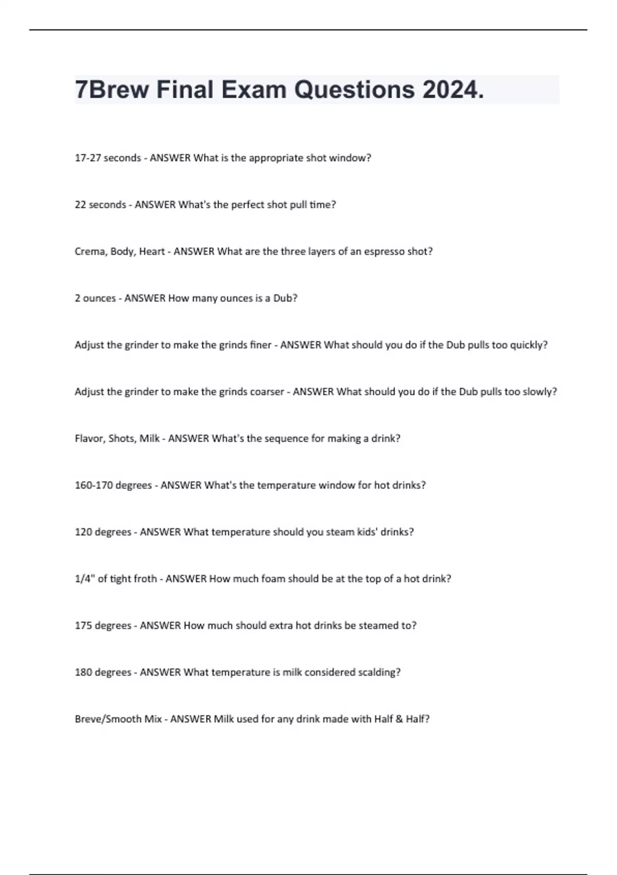 7Brew Final Exam Questions 2024 17-27 seconds - ANSWER What is the appropriate shot window? 22 seconds - ANSWER What's the perfect shot pull time? Crema, Body, Heart - ANSWER What are the three layers of an espresso shot? 2 ounces - ANSWER How many ounces is a Dub? Adjust the grinder to make the grinds finer - ANSWER What should you do if the Dub pulls too quickly? Adjust the grinder to make the grinds coarser - ANSWER What should you do if the Dub pulls too slowly? Flavor, Shots, Milk - ANSWER What's the sequence for making a drink? 160-170 degrees - ANSWER What's the temperature window for hot drinks? 120 degrees - ANSWER What temperature should you steam kids' drinks? 1/4" of tight froth - ANSWER How much foam should be at the top of a hot drink? 175 degrees - ANSWER How much should extra hot drinks be steamed to? 180 degrees - ANSWER What temperature is milk considered scalding? Breve/Smooth Mix - ANSWER Milk used for any drink made with Half & Half?