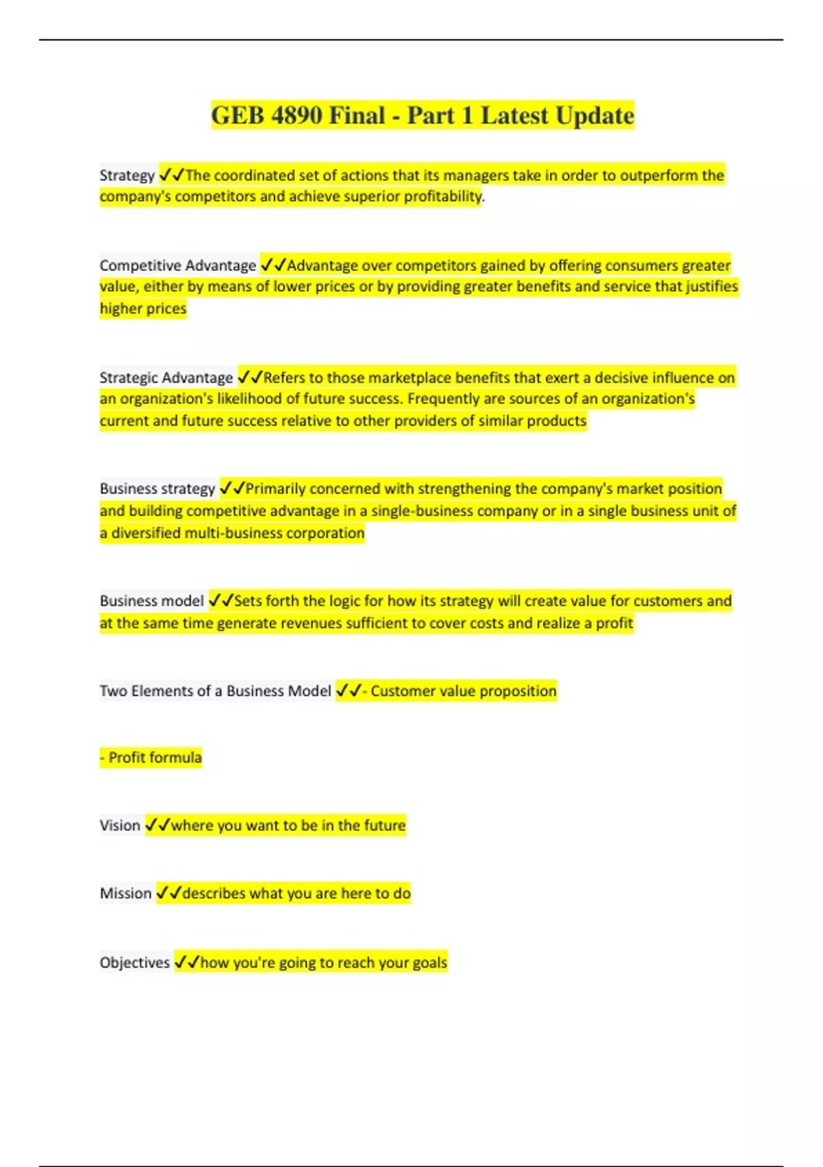 Strategy The coordinated set of actions that its managers take in order to outperform the company's competitors and achieve superior profitability. Competitive Advantage Advantage over competitors gained by offering consumers greater value, either by means of lower prices or by providing greater benefits and service that justifies higher prices Strategic Advantage Refers to those marketplace benefits that exert a decisive influence on an organization's likelihood of future success. Frequently are sources of an organization's current and future success relative to other providers of similar products Business strategy Primarily concerned with strengthening the company's market position and building competitive advantage in a single-business company or in a single business unit of a diversified multi-business corporation Business model Sets forth the logic for how its strategy will create value for customers and at the same time generate revenues sufficient to cover costs and realize a profit Two Elements of a Business Model - Customer value proposition - Profit formula Vision where you want to be in the future Mission describes what you are here to do Objectives how you're going to reach your goals