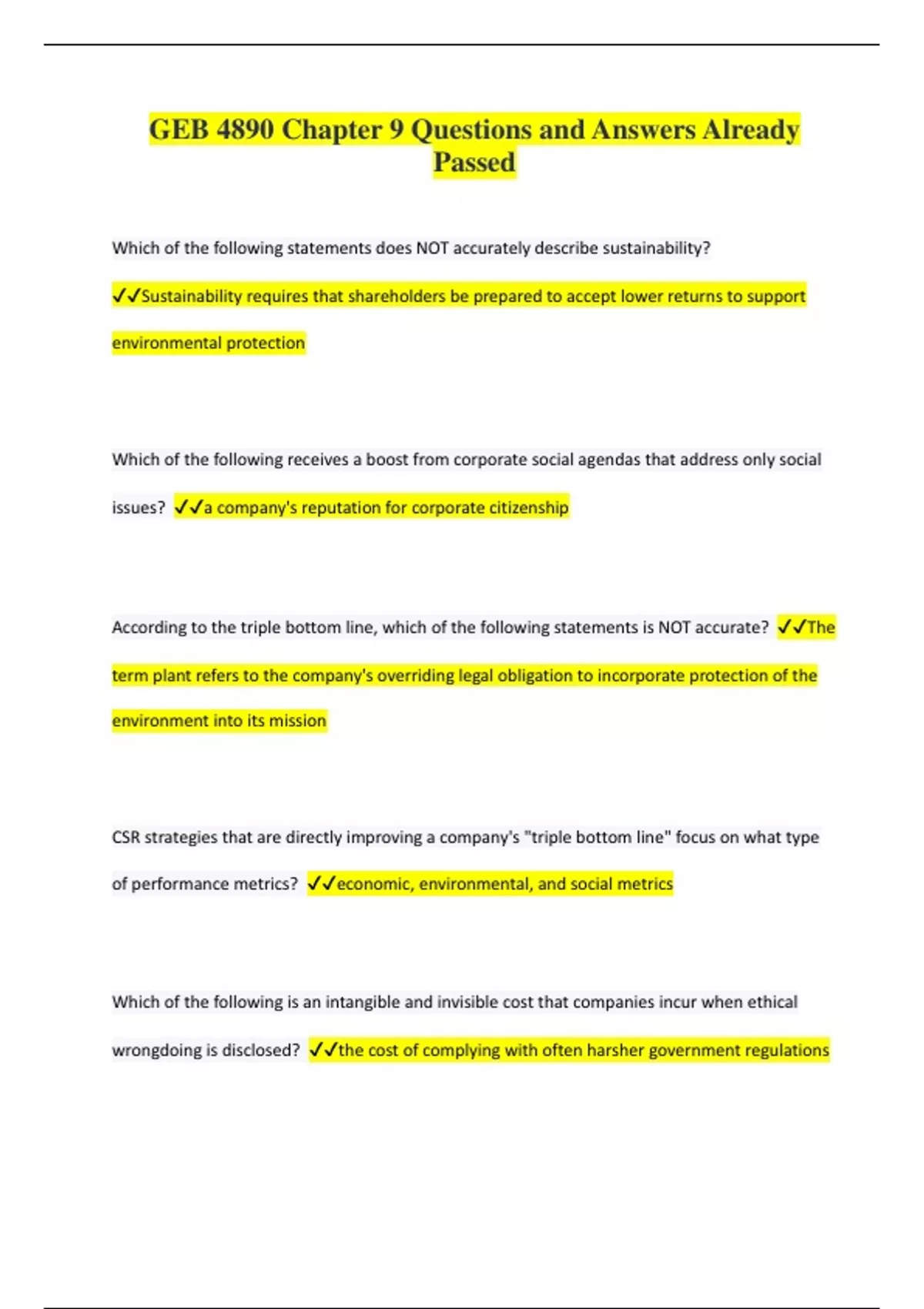 GEB 4890 Chapter 9 Questions and Answers Already Passed Which of the following statements does NOT accurately describe sustainability? Sustainability requires that shareholders be prepared to accept lower returns to support environmental protection Which of the following receives a boost from corporate social agendas that address only social issues? a company's reputation for corporate citizenship According to the triple bottom line, which of the following statements is NOT accurate? The term plant refers to the company's overriding legal obligation to incorporate protection of the environment into its mission CSR strategies that are directly improving a company's "triple bottom line" focus on what type of performance metrics? economic, environmental, and social metrics Which of the following is an intangible and invisible cost that companies incur when ethical wrongdoing is disclosed? the cost of complying with often harsher government regulations