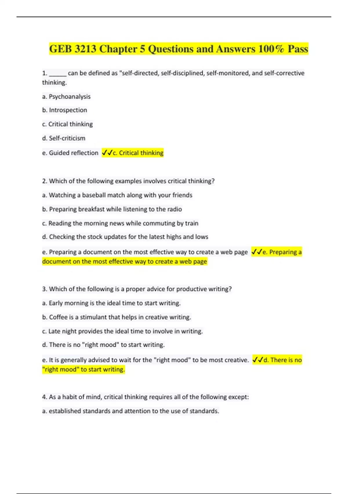 GEB 3213 Chapter 5 Questions and Answers 100% Pass 1. _____ can be defined as "self-directed, self-disciplined, self-monitored, and self-corrective thinking. a. Psychoanalysis b. Introspection c. Critical thinking d. Self-criticism e. Guided reflection c. Critical thinking 2. Which of the following examples involves critical thinking? a. Watching a baseball match along with your friends b. Preparing breakfast while listening to the radio c. Reading the morning news while commuting by train d. Checking the stock updates for the latest highs and lows e. Preparing a document on the most effective way to create a web page e. Preparing a document on the most effective way to create a web page 3. Which of the following is a proper advice for productive writing? a. Early morning is the ideal time to start writing. b. Coffee is a stimulant that helps in creative writing. c. Late night provides the ideal time to involve in writing. d. There is no "right mood" to start writing. e. It is generally advised to wait for the "right mood" to be most creative. d. There is no "right mood" to start writing.