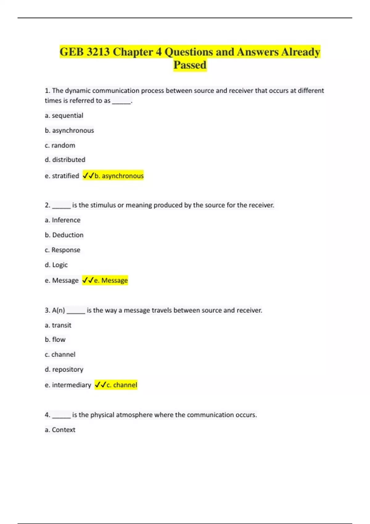 GEB 3213 Chapter 4 Questions and Answers Already Passed 1. The dynamic communication process between source and receiver that occurs at different times is referred to as _____. a. sequential b. asynchronous c. random d. distributed e. stratified b. asynchronous 2. _____ is the stimulus or meaning produced by the source for the receiver. a. Inference b. Deduction c. Response d. Logic e. Message e. Message 3. A(n) _____ is the way a message travels between source and receiver. a. transit b. flow c. channel d. repository e. intermediary c. channel