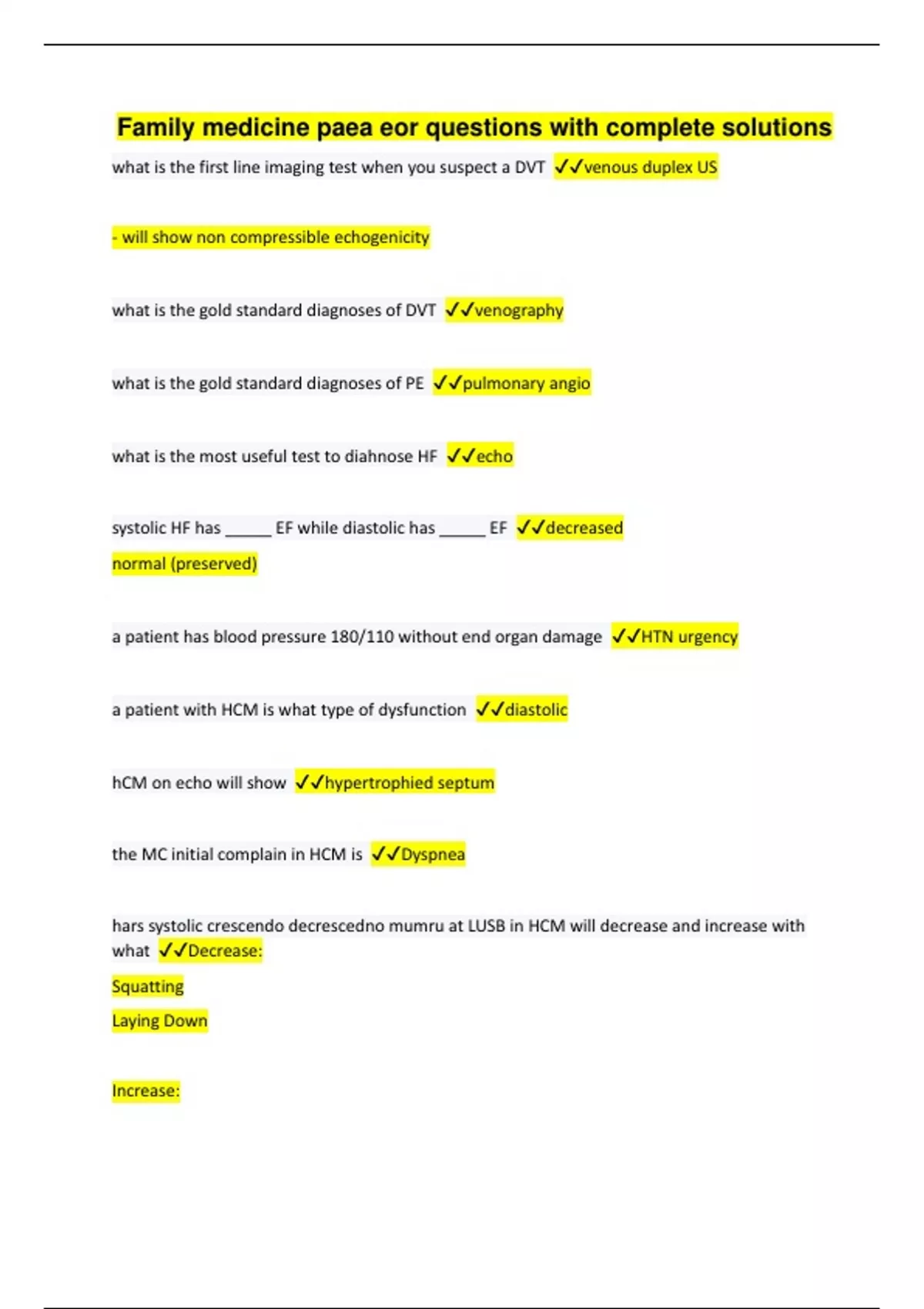 Family medicine paea eor questions with complete solutions what is the first line imaging test when you suspect a DVT venous duplex US - will show non compressible echogenicity what is the gold standard diagnoses of DVT venography what is the gold standard diagnoses of PE pulmonary angio what is the most useful test to diahnose HF echo systolic HF has _____ EF while diastolic has _____ EF decreased normal (preserved) a patient has blood pressure 180/110 without end organ damage HTN urgency a patient with HCM is what type of dysfunction diastolic hCM on echo will show hypertrophied septum the MC initial complain in HCM is Dyspnea hars systolic crescendo decrescedno mumru at LUSB in HCM will decrease and increase with what Decrease: Squatting Laying Down Increase: