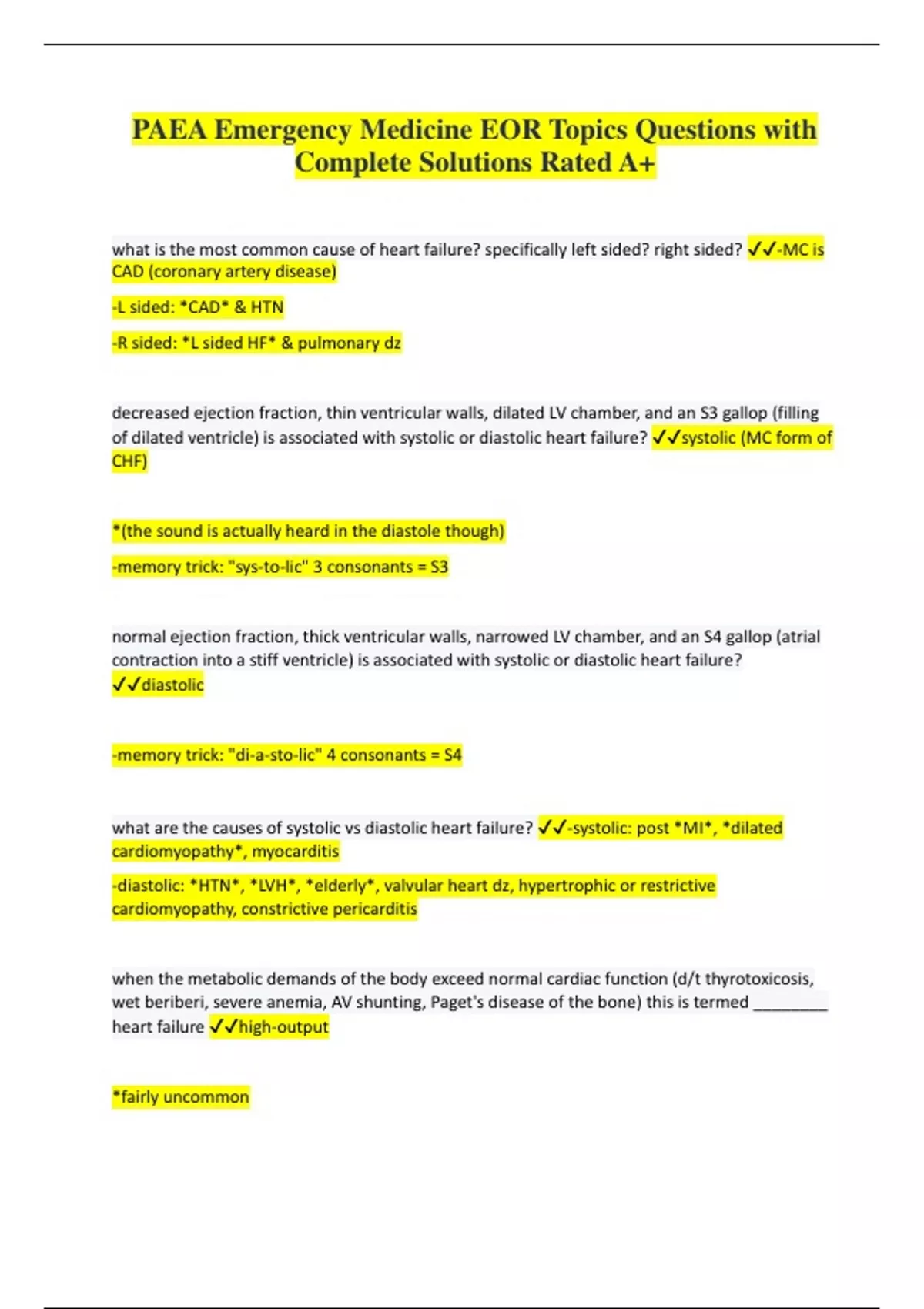 PAEA Emergency Medicine EOR Topics Questions with Complete Solutions Rated A+ what is the most common cause of heart failure? specifically left sided? right sided? -MC is CAD (coronary artery disease) -L sided: *CAD* & HTN -R sided: *L sided HF* & pulmonary dz decreased ejection fraction, thin ventricular walls, dilated LV chamber, and an S3 gallop (filling of dilated ventricle) is associated with systolic or diastolic heart failure? systolic (MC form of CHF) *(the sound is actually heard in the diastole though) -memory trick: "sys-to-lic" 3 consonants = S3 normal ejection fraction, thick ventricular walls, narrowed LV chamber, and an S4 gallop (atrial contraction into a stiff ventricle) is associated with systolic or diastolic heart failure? diastolic -memory trick: "di-a-sto-lic" 4 consonants = S4 what are the causes of systolic vs diastolic heart failure? -systolic: post *MI*, *dilated cardiomyopathy*, myocarditis -diastolic: *HTN*, *LVH*, *elderly*, valvular heart dz, hypertrophic or restrictive cardiomyopathy, constrictive pericarditis when the metabolic demands of the body exceed normal cardiac function (d/t thyrotoxicosis, wet beriberi, severe anemia, AV shunting, Paget's disease of the bone) this is termed ________ heart failure high-output