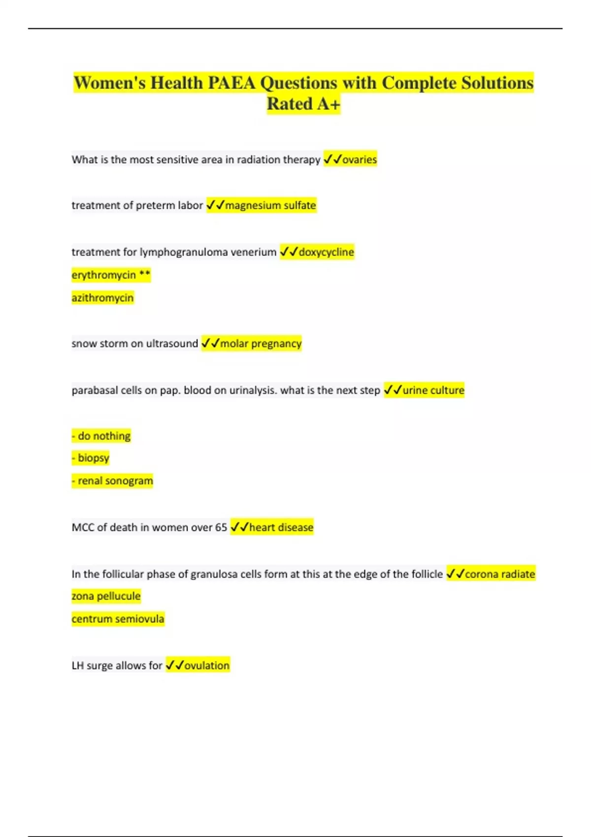 Women's Health PAEA Questions with Complete Solutions Rated A+ What is the most sensitive area in radiation therapy ovaries treatment of preterm labor magnesium sulfate treatment for lymphogranuloma venerium doxycycline erythromycin ** azithromycin snow storm on ultrasound molar pregnancy parabasal cells on pap. blood on urinalysis. what is the next step urine culture - do nothing - biopsy - renal sonogram MCC of death in women over 65 heart disease In the follicular phase of granulosa cells form at this at the edge of the follicle corona radiate zona pellucule centrum semiovula LH surge allows for ovulation