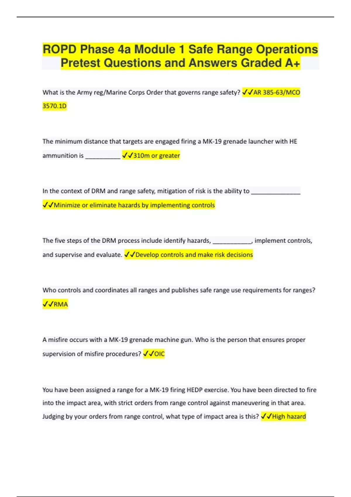 ROPD Phase 4a Module 1 Safe Range Operations Pretest Questions and Answers Graded A+ What is the Army reg/Marine Corps Order that governs range safety? AR 385-63/MCO 3570.1D The minimum distance that targets are engaged firing a MK-19 grenade launcher with HE ammunition is __________ 310m or greater In the context of DRM and range safety, mitigation of risk is the ability to ______________ Minimize or eliminate hazards by implementing controls The five steps of the DRM process include identify hazards, ___________, implement controls, and supervise and evaluate. Develop controls and make risk decisions Who controls and coordinates all ranges and publishes safe range use requirements for ranges? RMA A misfire occurs with a MK-19 grenade machine gun. Who is the person that ensures proper supervision of misfire procedures? OIC You have been assigned a range for a MK-19 firing HEDP exercise. You have been directed to fire into the impact area, with strict orders from range control against maneuvering in that area. Judging by your orders from range control, what type of impact area is this? High hazard