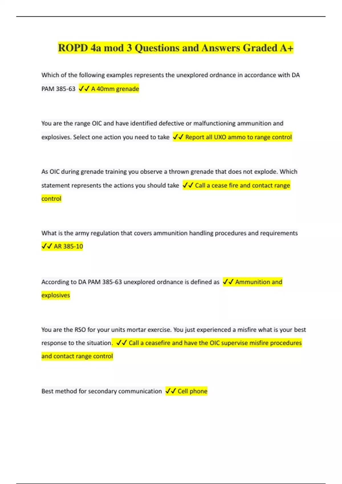 ROPD 4a mod 3 Questions and Answers Graded A+ Which of the following examples represents the unexplored ordnance in accordance with DA PAM 385-63 A 40mm grenade You are the range OIC and have identified defective or malfunctioning ammunition and explosives. Select one action you need to take Report all UXO ammo to range control As OIC during grenade training you observe a thrown grenade that does not explode. Which statement represents the actions you should take Call a cease fire and contact range control What is the army regulation that covers ammunition handling procedures and requirements AR 385-10 According to DA PAM 385-63 unexplored ordnance is defined as Ammunition and explosives You are the RSO for your units mortar exercise. You just experienced a misfire what is your best response to the situation. Call a ceasefire and have the OIC supervise misfire procedures and contact range control