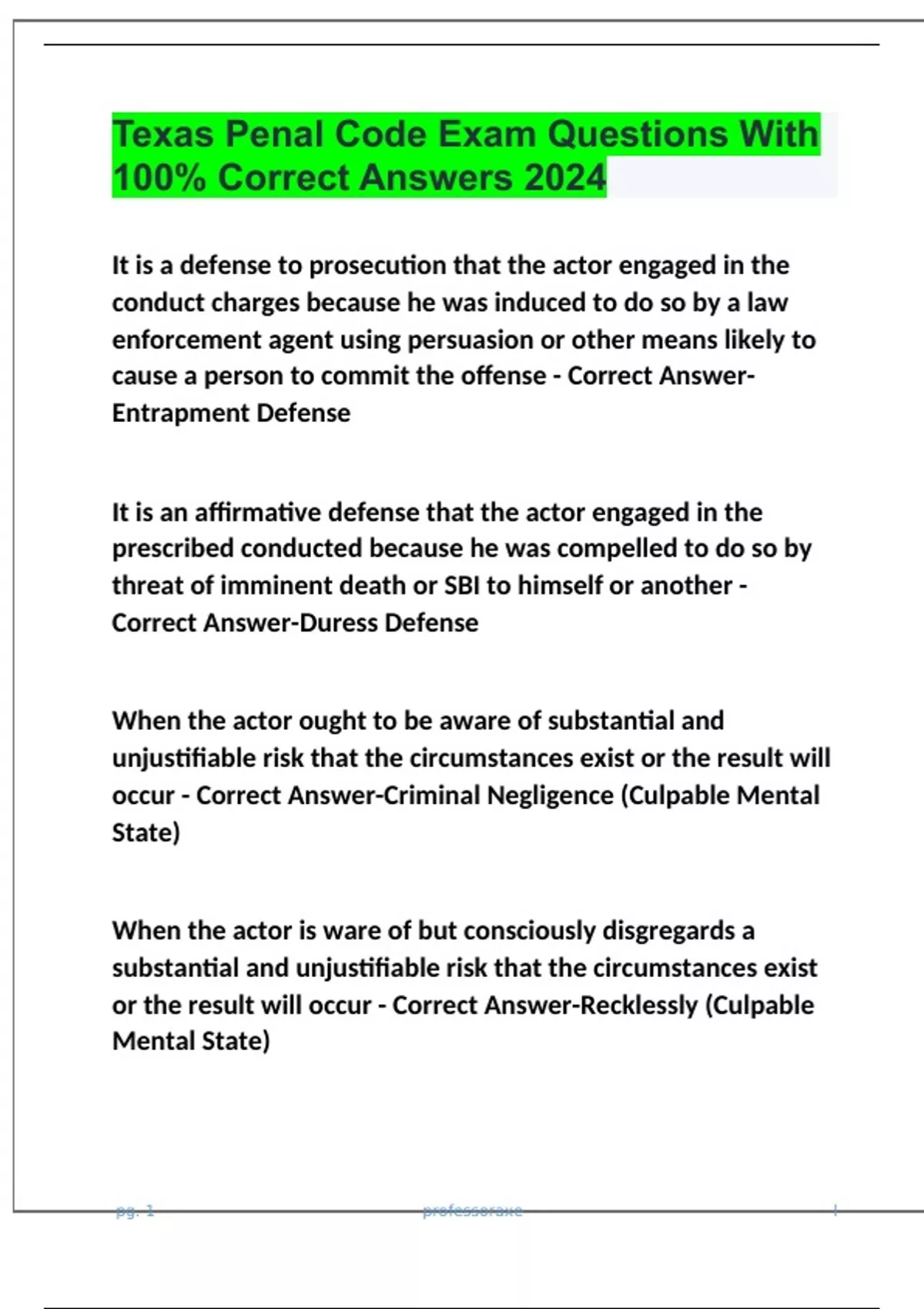Texas Penal Code Exam Questions With 100% Correct Answers 2024