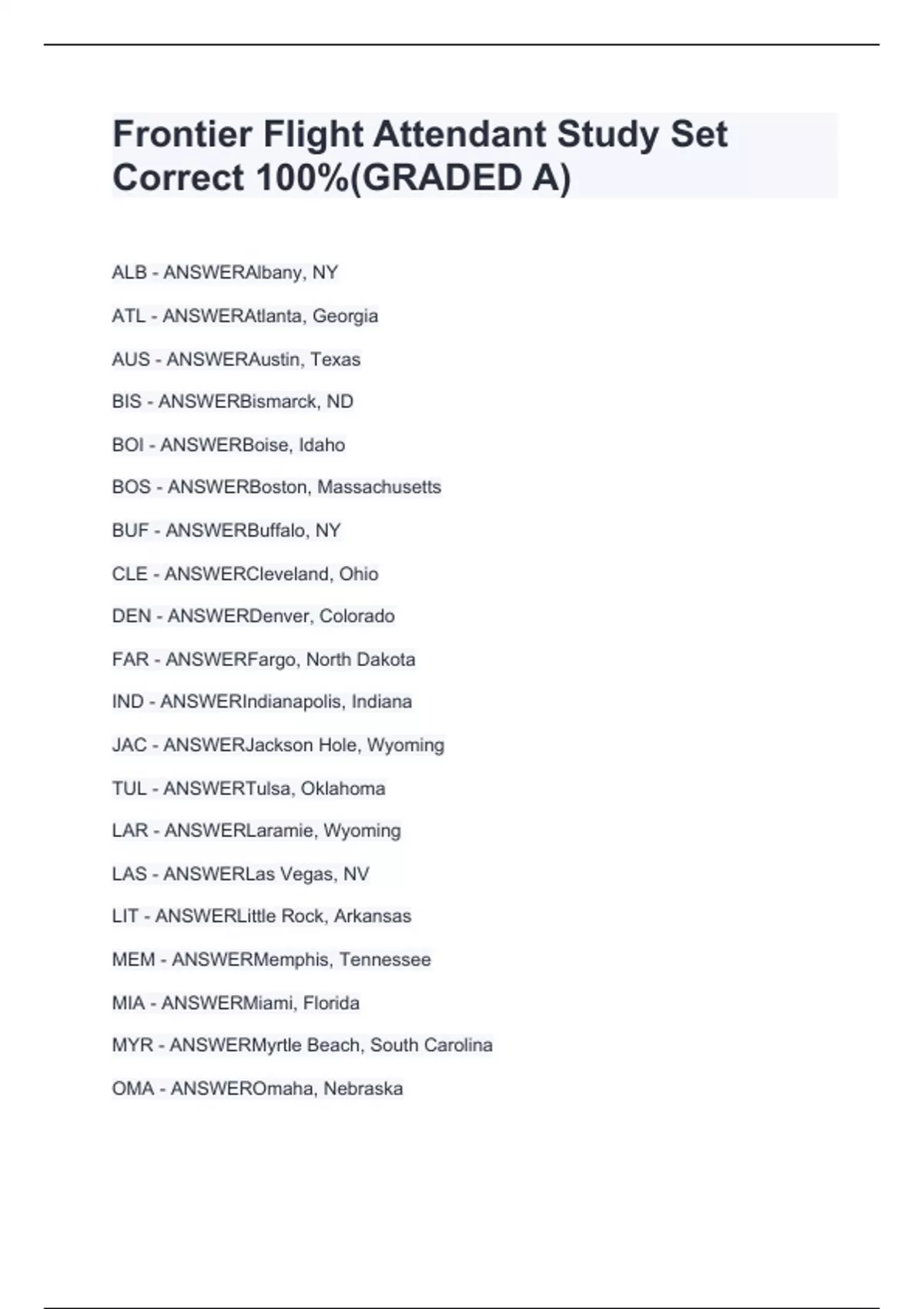 ALB - ANSWERAlbany, NY ATL - ANSWERAtlanta, Georgia AUS - ANSWERAustin, Texas BIS - ANSWERBismarck, ND BOI - ANSWERBoise, Idaho BOS - ANSWERBoston, Massachusetts BUF - ANSWERBuffalo, NY CLE - ANSWERCleveland, Ohio DEN - ANSWERDenver, Colorado FAR - ANSWERFargo, North Dakota IND - ANSWERIndianapolis, Indiana JAC - ANSWERJackson Hole, Wyoming TUL - ANSWERTulsa, Oklahoma LAR - ANSWERLaramie, Wyoming LAS - ANSWERLas Vegas, NV LIT - ANSWERLittle Rock, Arkansas MEM - ANSWERMemphis, Tennessee MIA - ANSWERMiami, Florida MYR - ANSWERMyrtle Beach, South Carolina OMA - ANSWEROmaha, Nebraska PIT - ANSWERPittsburgh, Pennsylvania