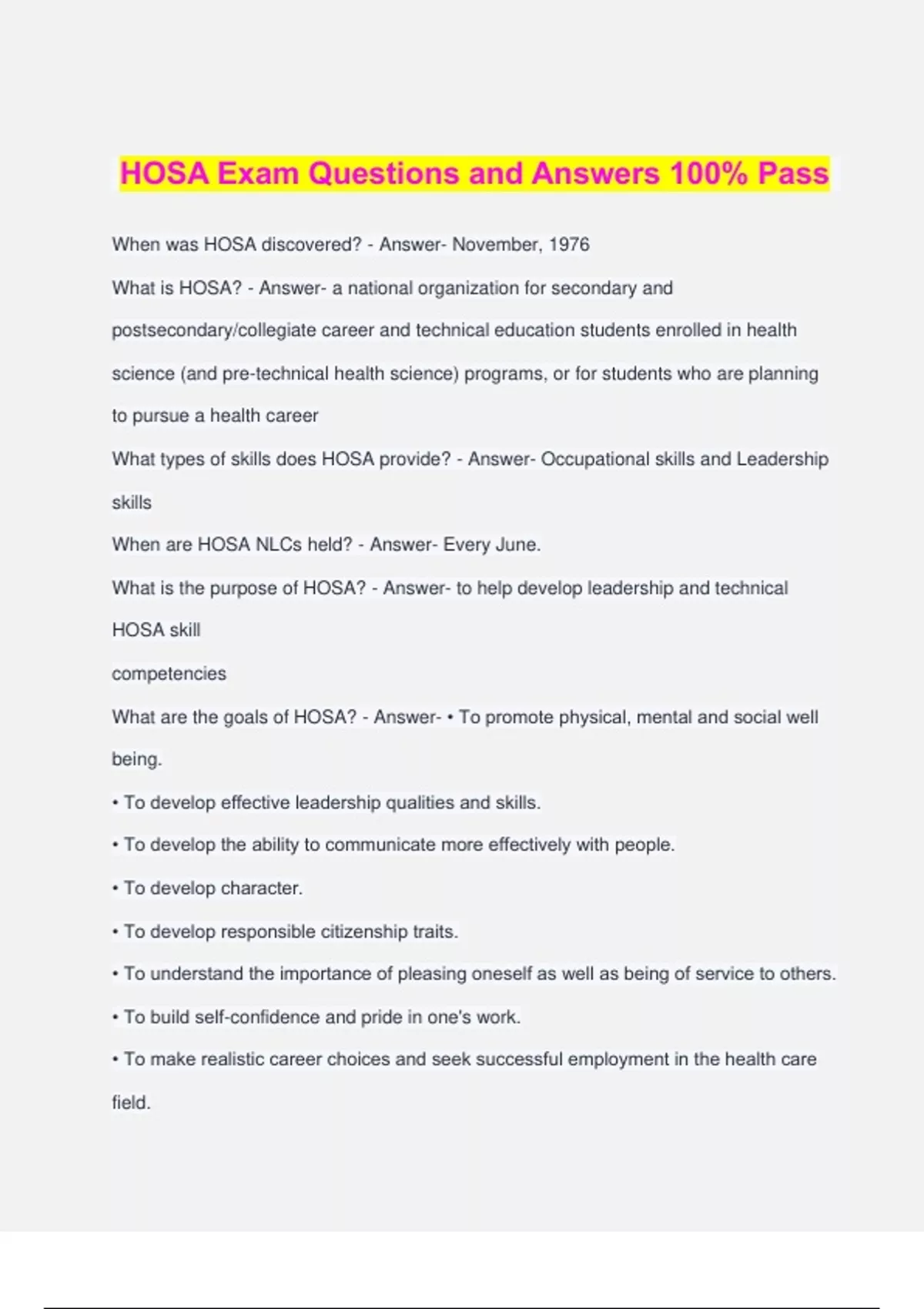 HOSA Exam Questions and Answers 100% Pass When was HOSA discovered? - Answer- November, 1976 What is HOSA? - Answer- a national organization for secondary and postsecondary/collegiate career and technical education students enrolled in health science (and pre-technical health science) programs, or for students who are planning to pursue a health career What types of skills does HOSA provide? - Answer- Occupational skills and Leadership skills When are HOSA NLCs held? - Answer- Every June. What is the purpose of HOSA? - Answer- to help develop leadership and technical HOSA skill competencies What are the goals of HOSA? - Answer- • To promote physical, mental and social well being. • To develop effective leadership qualities and skills. • To develop the ability to communicate more effectively with people. • To develop character. • To develop responsible citizenship traits. • To understand the importance of pleasing oneself as well as being of service to others. • To build self-confidence and pride in one's work. • To make realistic career choices and seek successful employment in the health care field. • To develop an understanding of the importance in interacting and cooperating with other students and organizations. • To encourage individual and group achievement. • To develop an understanding of current health care issues, environmental concerns, and survival needs of the community, the nation and the world. • To encourage involvement in local, state and national health care and education projects. • To support Health Science Education instructional objectives. • To promote career opportunities in Health Care. What does Level III stand for? - Answer- National Organization Who supports Level III? - Answer- United States Department of Education What are state affiliations classified as? - Answer- Active or inactive state associations HOS Inc. corporate body elects - Answer- non-student members to the Board of Directors What is the National Officer Advisor a part of? - Answer- HOSA management team What is the Executive Council composed of? - Answer- national officers What does the Executive Council do? - Answer- presides and conducts the business of the organization through the annual meeting of the Delegate Assembly What does State association voting delegates in the Delegate Assembly do? - Answer- consider business of National HOSA, elect national officers at the National Conference, amend bylaws, make crucial decisions, and approve action What does HOSA, Inc. Standing and Ad-hoc Committees do? - Answer- plan and conduct programs/activities What does Level II stand for? - Answer- State Associations What is Level II supported by? - Answer- by the appropriate state education agency or a HOSA, Inc. Board approved sponsoring agency/institution How are State and district/regional/area officers elected? - Answer- by local chapter voting delegates How many people serve as HOSA State Advisor from the Department of Education and/or sponsoring agency/institution? - Answer- one or more What does a state association Board of Directors/Trustees and/or Executive Committee do? - Answer- provides/advises/governs the state association What does Level I stand for? - Answer- local chapters What is a local HOSA chapter composed of? - Answer- secondary, and/or postsecondary/collegiate students pursuing a health career Who serves as HOSA chapter advisor? - Answer- Health science instructor What happens when chapter is not part of heal