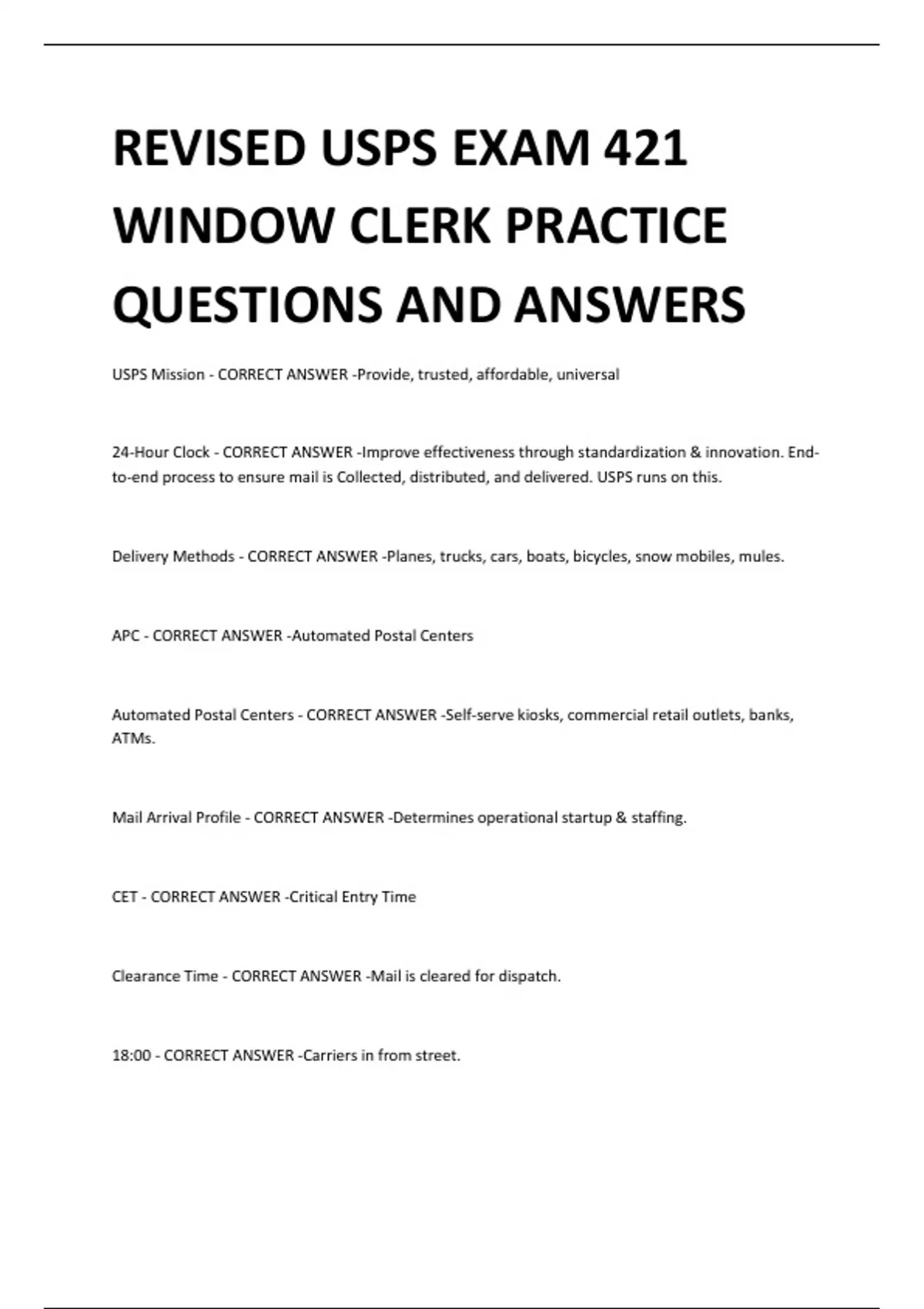 REVISED USPS EXAM 421 WINDOW CLERK PRACTICE QUESTIONS AND ANSWERS USPS Mission - CORRECT ANSWER -Provide, trusted, affordable, universal 24-Hour Clock - CORRECT ANSWER -Improve effectiveness through standardization & innovation. Endto-end process to ensure mail is Collected, distributed, and delivered. USPS runs on this. Delivery Methods - CORRECT ANSWER -Planes, trucks, cars, boats, bicycles, snow mobiles, mules. APC - CORRECT ANSWER -Automated Postal Centers Automated Postal Centers - CORRECT ANSWER -Self-serve kiosks, commercial retail outlets, banks, ATMs. Mail Arrival Profile - CORRECT ANSWER -Determines operational startup & staffing. CET - CORRECT ANSWER -Critical Entry Time Clearance Time - CORRECT ANSWER -Mail is cleared for dispatch. 18:00 - CORRECT ANSWER -Carriers in from street. 20:00 - CORRECT ANSWER -80% of collection mail should be cancelled at the P&DC. 23:00 - CORRECT ANSWER -Out of primary processing. 24:00 - CORRECT ANSWER -Secondary Operations Complete 04:00-09:00 - CORRECT ANSWER -Distribute to DDC/DDU 07:00 - CORRECT ANSWER -100% of DPS 2nd pass complete. Core Responsibility - CORRECT ANSWER -Security, Sanctity, Preserve, Protect - Instills customer confidence, projects positive public image, maintains competitive advantage, protects privacy. PolicyNet - CORRECT ANSWER -Online resource to find handbooks, manuals, publications. Directives - CORRECT ANSWER -Policies, Procedures, Regulations - Effects in four ways: productivity, revenue, legal liability, customer service. DMM - CORRECT ANSWER -Domestic Mail Manual Domestic Mail Manual - CORRECT ANSWER -DMM - Policies, procedures and regulatins for domestic mail. Information on extra services, postage prices, mail classes. IMM - CORRECT ANSWER -International Mail Manual International Mail Manual - CORRECT ANSWER -IMM - Mailing conditions for each country, also includes a list of countries.