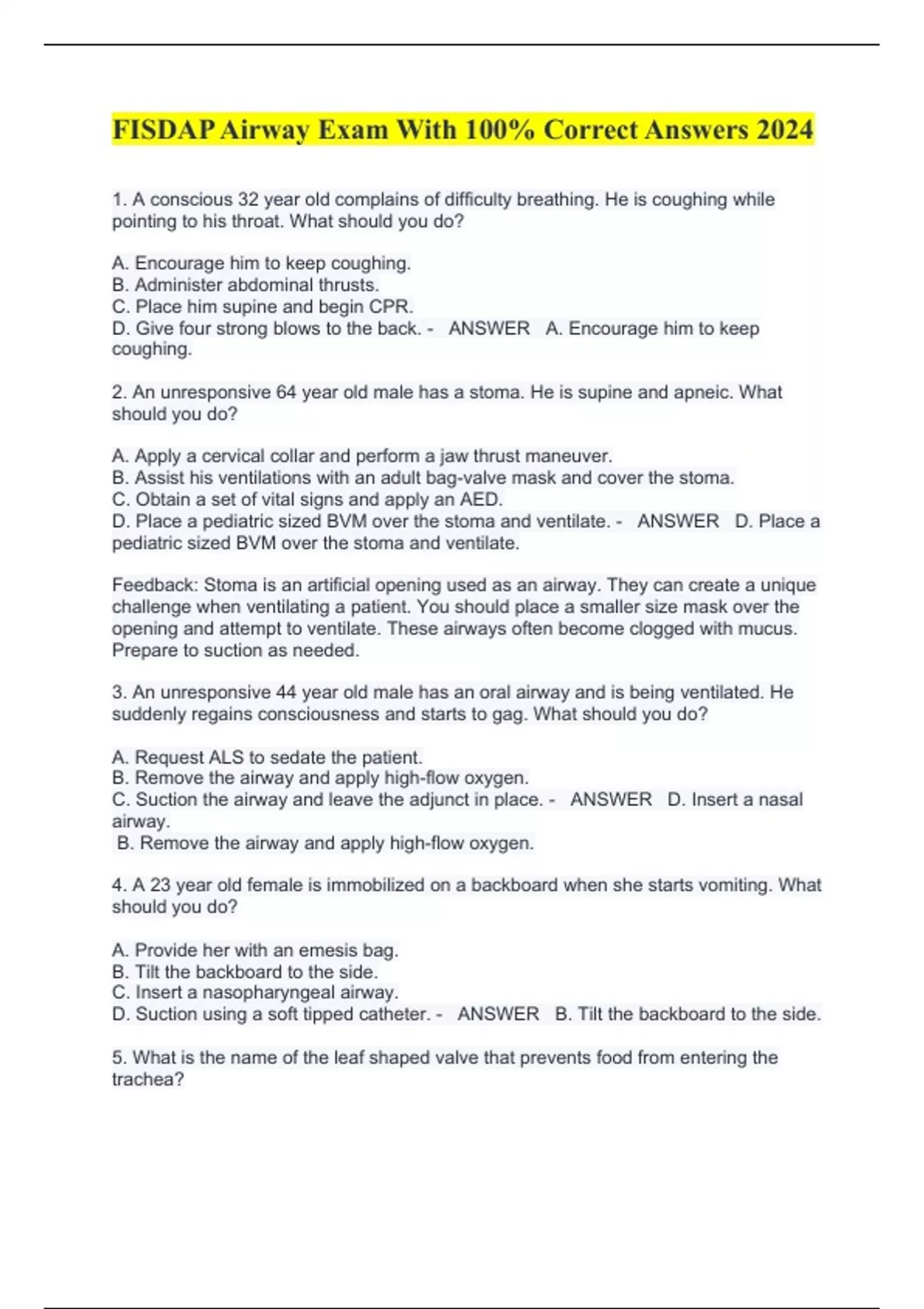 1. A conscious 32 year old complains of difficulty breathing. He is coughing while pointing to his throat. What should you do? A. Encourage him to keep coughing. B. Administer abdominal thrusts. C. Place him supine and begin CPR. D. Give four strong blows to the back. - ANSWER A. Encourage him to keep coughing. 2. An unresponsive 64 year old male has a stoma. He is supine and apneic. What should you do? A. Apply a cervical collar and perform a jaw thrust maneuver. B. Assist his ventilations with an adult bag-valve mask and cover the stoma. C. Obtain a set of vital signs and apply an AED. D. Place a pediatric sized BVM over the stoma and ventilate. - ANSWER D. Place a pediatric sized BVM over the stoma and ventilate. Feedback: Stoma is an artificial opening used as an airway. They can create a unique challenge when ventilating a patient. You should place a smaller size mask over the opening and attempt to ventilate. These airways often become clogged with mucus. Prepare to suction as needed. 3. An unresponsive 44 year old male has an oral airway and is being ventilated. He suddenly regains consciousness and starts to gag. What should you do? A. Request ALS to sedate the patient. B. Remove the airway and apply high-flow oxygen. C. Suction the airway and leave the adjunct in place. - ANSWER D. Insert a nasal airway. B. Remove the airway and apply high-flow oxygen. 4. A 23 year old female is immobilized on a backboard when she starts vomiting. What should you do? A. Provide her with an emesis bag. B. Tilt the backboard to the side. C. Insert a nasopharyngeal airway. D. Suction using a soft tipped catheter. - ANSWER B. Tilt the backboard to the side. 5. What is the name of the leaf shaped valve that prevents food from entering the trachea? A. Pharynx B. Larynx C. Epiglottis D. Bronchi - ANSWER C. Epiglottis 6. The air that we exhale contains approximately how much oxygen? A. 35% B. 21% C. 6% D. 16% - ANSWER D. 16% 7. What condition results when the alveoli collapse? A. Pneumothorax B. Pneumonia C. Atelectasis D. Effusion - ANSWER C. Atelectasis 8. A 54 year old female is in respiratory arrest and has inadequate chest rise during ventilations. What should you do? A. Check for a FBAO B. Asses end tidal CO2 C. Determine her SpO2 D. Reposition the jaw - ANSWER D. Reposition the jaw 9. Where does the stimulus to breathe originate? A. Brainstem B. Diaphragm