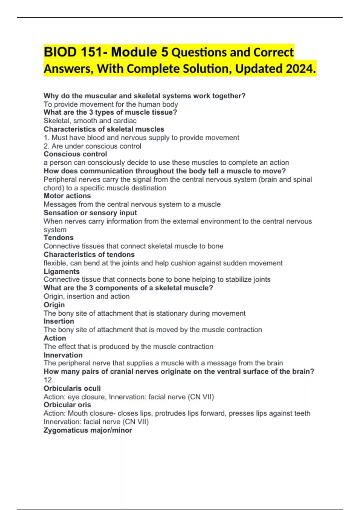 BIOD 151- Module 5 Questions and Correct Answers, With Complete Solution, Updated 2024. Why do the muscular and skeletal systems work together? To provide movement for the human body What are the 3 types of muscle tissue? Skeletal, smooth and cardiac Characteristics of skeletal muscles 1. Must have blood and nervous supply to provide movement 2. Are under conscious control Conscious control a person can consciously decide to use these muscles to complete an action How does communication throughout the body tell a muscle to move? Peripheral nerves carry the signal from the central nervous system (brain and spinal chord) to a specific muscle destination Motor actions Messages from the central nervous system to a muscle Sensation or sensory input When nerves carry information from the external environment to the central nervous system Tendons Connective tissues that connect skeletal muscle to bone Characteristics of tendons flexible, can bend at the joints and help cushion against sudden movement Ligaments Connective tissue that connects bone to bone helping to stabilize joints What are the 3 components of a skeletal muscle? Origin, insertion and action Origin The bony site of attachment that is stationary during movement Insertion The bony site of attachment that is moved by the muscle contraction Action The effect that is produced by the muscle contraction Innervation The peripheral nerve that supplies a muscle with a message from the brain How many pairs of cranial nerves originate on the ventral surface of the brain? 12 Orbicularis oculi Action: eye closure, Innervation: facial nerve (CN VII) Orbicular oris Action: Mouth closure- closes lips, protrudes lips forward, presses lips against teeth Innervation: facial nerve (CN VII) Zygomaticus major/minor Action: pull corners of lips upward, Innervation: facial nerve (CN VII) Risorius Action: pulls the corners of the mouth posteriorly (grin or grimace), Innervation: Facial nerve (CN VII) Frontalis (occipitofrontailis) Action: Raise eyebrows, Innervation: facial nerve (CN VII) Buccinator Action: compress cheeks, Innervation: facial nerve (CN VII) Masseter Action: Jaw closure, Innervation: trigeminal nerve (CN V, mandibular branch) Temporalis Action: Elevates mandible, closes jaw, Innervation: trigeminal nerve (CN V, mandibular branch) Agonist The muscle that contract as the primary movement in a pair Antagonist The muscle that moves secondarily to relax the contracted muscle Lateral flexion of the head/neck Moving one of the ears to the same side shoulder Neck flexion Moving the chin towards the sternum Bilaterally both sides Unilaterally Performed in a one-sided manner Semispinalis Capitis Origin: Articular processes of inferior cervical and transverse process of superior thoracic vertebrae Insertion: occipital bone Action: Bilateral extend head, unilateral laterally flexes neck to same side Innervation: Spinal nerves Sternocleidomastoid Origin: Sternal end of clavicle and manubrium Insertion: Mastoid region of skull Action: Bilateral: neck flection, Unilateral: turns face to opposite side Innervation: accessory nerve (CN XI) Splenius Capitis Origin: Spinous process/ligaments of inferior cervical vertebrae Insertion: Mastoid process, occipital bone of skull Action: Bilateral: extend head, Unilateral: Laterally flexes neck to same side Innervation: Cervial spinal nerves Longissimus Cervicis Origin: Transverse process of superior thoracic vertebrae Insertion: Transverse process of middle and superior cervical vertebrae Action: Bilateral: extend head, Unilateral: Laterally flexes neck to same side Innervation: Cervical and thoracic spinal nerves Longissimus Thoracis Origin: transverse process of all thoracic and lumbar vertebrae Insertion: transverse processes of all thoracic vertebrae Action: Bilateral: extension of spine, Unilaterally: lateral flexion of spine Innervation: Thoracic and lumbar spinal nerves Thyrohyoid Origin: Thyroid cartilage of larynx Insertion: Hyoid bone Action: Elevates thyroid, depresses hyoid bone Innervation: Hypoglossal nerve Scalenes (anterior, middle, posterior) Origin: Transverse processes of C2-C7 Insertion: First and second ribs Action: elevates ribs 1 & 2 Innervation: Cervical spinal nerves Flexion of the spine Forward bending the trunk (cat stretch) Extension of the spine Backward bending of the trunk Spinalis Medial column of erector spinae, Action: Spinal extension What are the 3 divisions of the Spinalis? Spinals thoracic, spinalis services, and spinals capitis Longissimus Intermediate column of erector spinae, Action: Spinal extension What are the 3 divisions of the longissimus? Longissimus thoracic, longissimus crevices, longissimus capitits Illiocostalis Lateral column of erector spinae, Action: Spinal extension What are the 3 divisions of the illiocostalis? Iliocostalis lumborum, iliocostalis thoracis, illiocostalis cervicis Rectus abdominis Origin: Pubic Crest, Pubic symphysis Insertion: Cartilages of ribs 5-7, diploid process Action: Flection of spine, compression of abdominal viscera Innervation: Spinal nerves (T 7-T 12) External oblique Origin: Sternum, ribs (5-12) Insertion: Linea alba, iliac crest Action: Bilaterally: Flection of the spine, compress the abdomen, Unilaterally: Flexes trunk to same side, rotates to opposite side Innervation: Lower intercostal, illioinguinal nerves Internal oblique Origin: Iliac crest, lumbodorsal fascia Insertion: Inferior ribs, linea alba