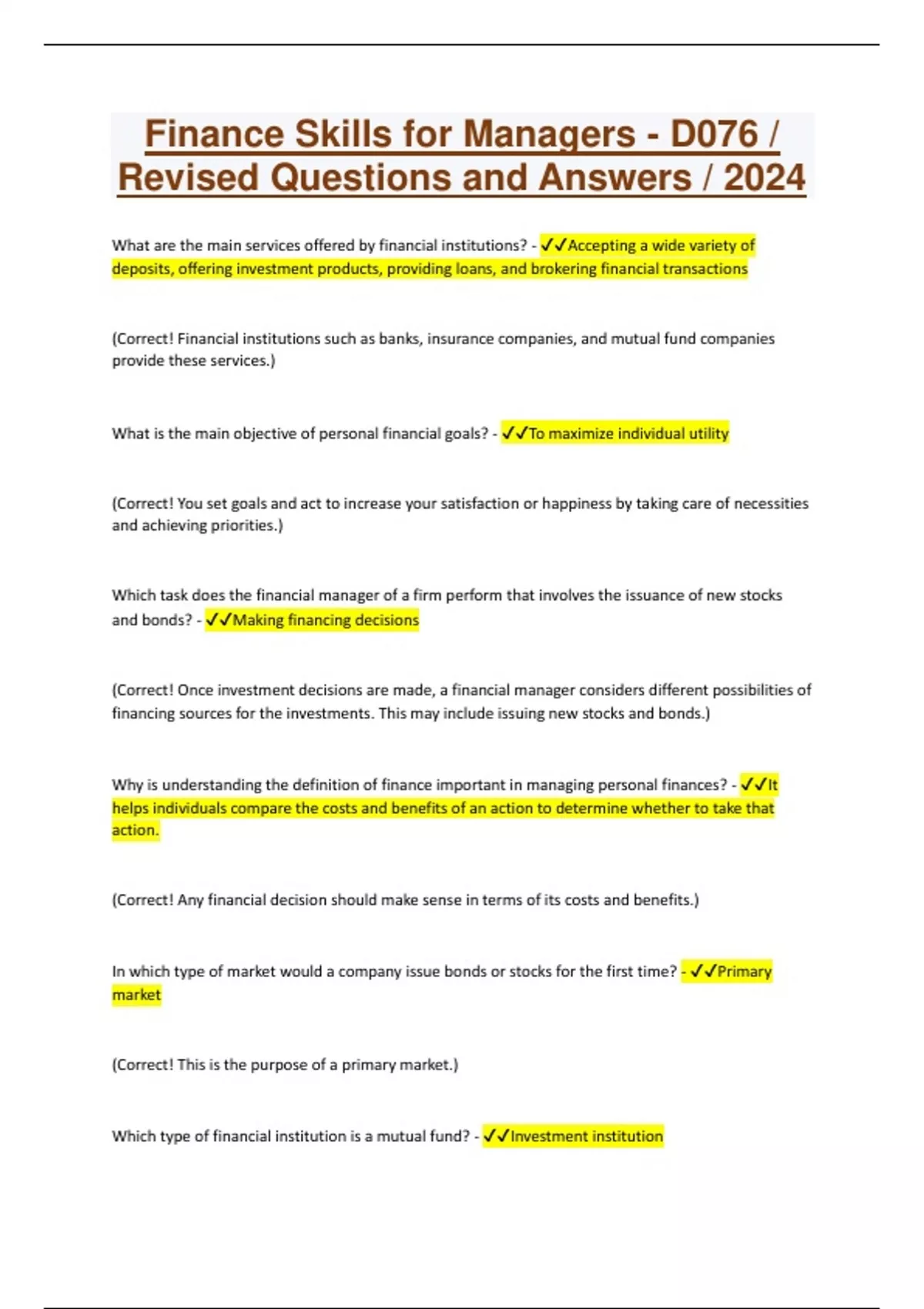 Finance Skills for Managers - D076 / Revised Questions and Answers / 2024