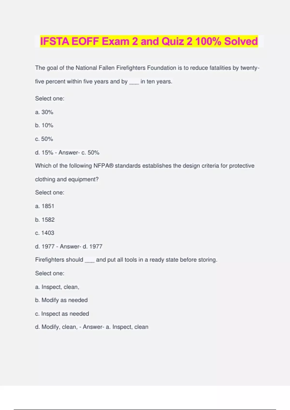 IFSTA EOFF Exam 2 and Quiz 2 100% Solved The goal of the National Fallen Firefighters Foundation is to reduce fatalities by twenty- five percent within five years and by ___ in ten years. Select one: a. 30% b. 10% c. 50% d. 15% - Answer- c. 50% Which of the following NFPA® standards establishes the design criteria for protective clothing and equipment? Select one: a. 1851 b. 1582 c. 1403 d. 1977 - Answer- d. 1977 Firefighters should ___ and put all tools in a ready state before storing. Select one: a. Inspect, clean, b. Modify as needed c. Inspect as needed d. Modify, clean, - Answer- a. Inspect, clean Which of the following is one way firefighters can reduce exposure to carcinogens present in fires? Select one: a. Maintain positive mental attitudes b. Clean helmet liners c. Maintain high levels of physical fitness d. Follow good nutritional guidelines - Answer- b. Clean helmet liners Which of the following is a goal of fire department safety and health programs? Select one: a. Prevent fires in jurisdiction b. Prevent damage to emergency response equipment c. Prevent high insurance premiums d. Prevent damage to environment during emergency incidents - Answer- b. Prevent damage to emergency response equipment The distance the apparatus travels from when the driver/operator realizes the need to stop, until the driver/operator's foot touches the brake pedal is: Select one: a. A very brief time. b. A longer time than in a private vehicle. c. Called braking distance. d. Called driver-reaction distance. - Answer- d. Called driver-reaction distance Which of the following groups does an Employee Assistance Program offer assistance to? Select one: a. Firefighters and their families b. Firefighters c. Only firefighters with marital problems d. Only firefighters with drug abuse problems - Answer- a. Firefighters and theirs families Occupational Safety and Health Administration (OSHA) regulations only apply to federal employees unless: Select one: a. A federal jurisdiction decides not to adopt part of the regulations. b. A state jurisdiction decides to adopt them as part of local regulations. c. Local jurisdiction exempts the adoption of certain regulations. d. Federal jurisdiction exempts the adoption of certain regulations. - Answer- b. A state jurisdiction decides to adopt them as part of local regulations Which of the following statements BEST describes the difference between acute and chronic illness? Select one: a. Acute is more painful, chronic is less invasive. b. Acute is more serious than chronic. c. Acute requires a doctor visit, chronic may not. d. Acute is short term, chronic is long lasting. - Answer- d. Acute is short term, chronic is long lasting