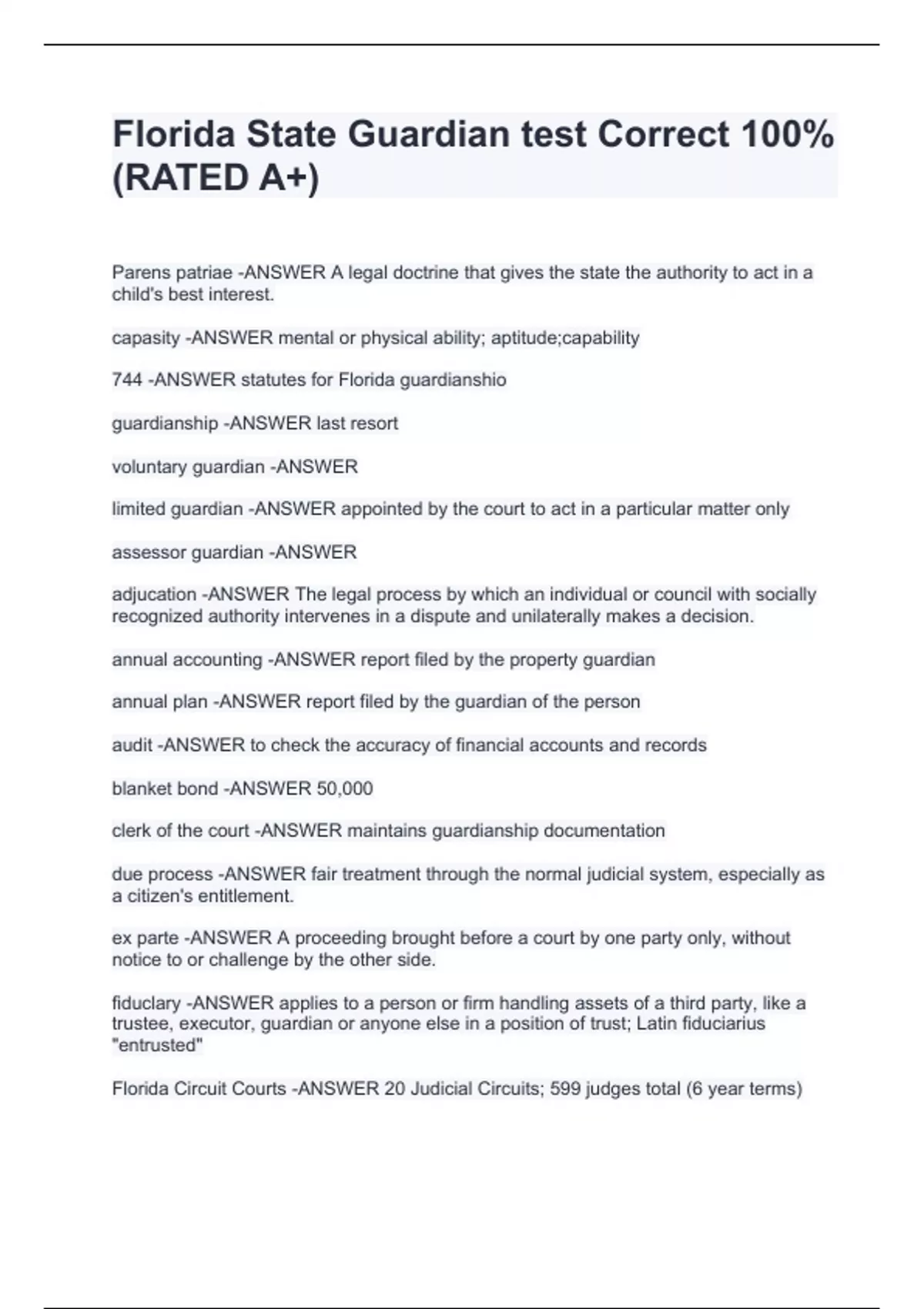 florida state guardian test correct stuvia