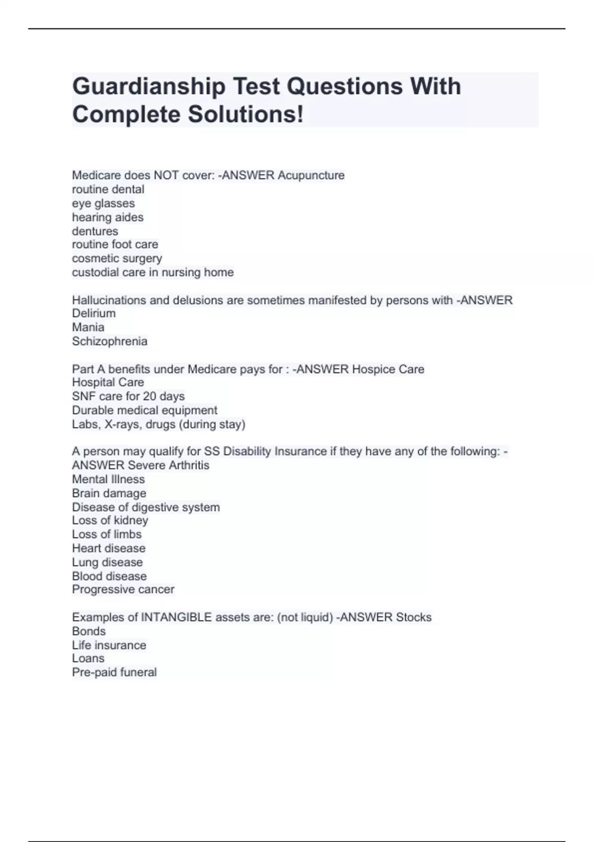 Medicare does NOT cover: -ANSWER Acupuncture routine dental eye glasses hearing aides dentures routine foot care cosmetic surgery custodial care in nursing home Hallucinations and delusions are sometimes manifested by persons with -ANSWER Delirium Mania Schizophrenia Part A benefits under Medicare pays for : -ANSWER Hospice Care Hospital Care SNF care for 20 days Durable medical equipment Labs, X-rays, drugs (during stay) A person may qualify for SS Disability Insurance if they have any of the following: -ANSWER Severe Arthritis Mental Illness Brain damage Disease of digestive system Loss of kidney Loss of limbs Heart disease Lung disease Blood disease Progressive cancer Examples of INTANGIBLE assets are: (not liquid) -ANSWER Stocks Bonds Life insurance Loans Pre-paid funeral Guardian should obtain court approval for any of the following medical procedures: -ANSWER Elective surgery Amputation of body part Lis
