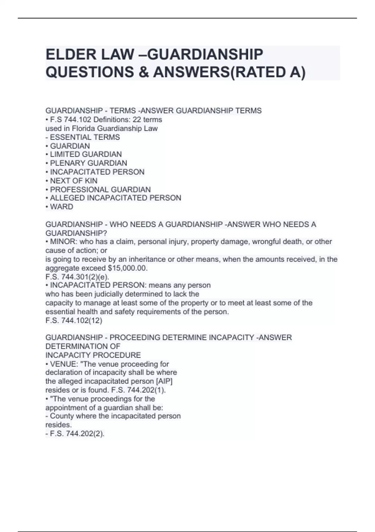 ELDER LAW –GUARDIANSHIP QUESTIONS & ANSWERS(RATED A)