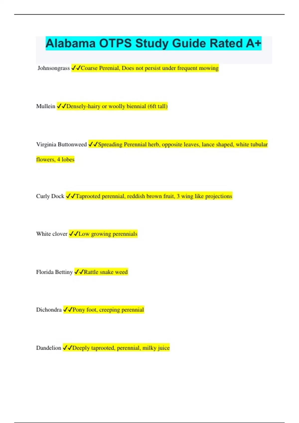 Alabama OTPS Study Guide Rated A+ Johnsongrass Coarse Perenial, Does not persist under frequent mowing Mullein Densely-hairy or woolly biennial (6ft tall) Virginia Buttonweed Spreading Perennial herb, opposite leaves, lance shaped, white tubular flowers, 4 lobes Curly Dock Taprooted perennial, reddish brown fruit, 3 wing like projections White clover Low growing perennials Florida Bettiny Rattle snake weed Dichondra Pony foot, creeping perennial Dandelion Deeply taprooted, perennial, milky juice Chickweed Mat-forming winter annual Pigweed Tall annual, erect smooth to hairy stems Wild garlic Cool season perennial, absence of fibrous coat on central bulb, Annual bluegrass Clumped winter annual, spikelets Dallisgrass 3-7 alternating branches of spikeletts Goosegrass Crowfoot, silver crabgrass Southern crabgrass Spreading summer annual, 2-9 fingerlike spikelets Smooth crabgrass 2-6 fingerlike spikelets, spreading summer annual Purple nutsedge Rapid spreading, perennial, 3 ranked basal leaves, seed head purple to reddish brown Yellow nutsedge Perennial, yellowish-brown seedhead Billbugs Main Pest of zoysia and Bermudagrass White grubs C-shaped Mole crickets Most destructive insect Pest on alabama turf, $7 million, tawny, southern Tanner mole cricket Tan, V shaped Southern mole cricket Gray, U shaped Cutworms Feed at night, hide at day Chinch bugs St augustinegrass, rice size,