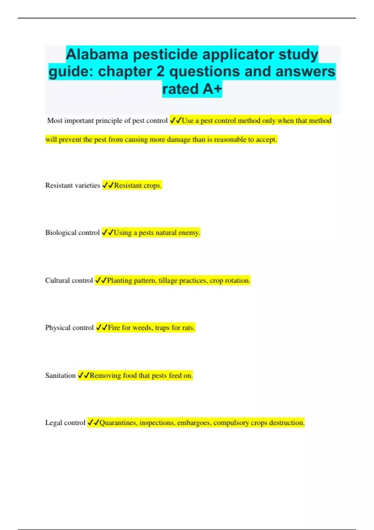 Alabama pesticide applicator study guide: chapter 2 questions and answers rated A+ Most important principle of pest control Use a pest control method only when that method will prevent the pest from causing more damage than is reasonable to accept. Resistant varieties Resistant crops. Biological control Using a pests natural enemy. Cultural control Planting pattern, tillage practices, crop rotation. Physical control Fire for weeds, traps for rats. Sanitation Removing food that pests feed on. Legal control Quarantines, inspections, embargoes, compulsory crops destruction. Pesticides Chemicals used to destroy, prevent, or control pests. 3 main pest control strategies. Prevention, suppression, eradication. Insecticide Kills insects Miticide Kills mites Acaricide Kills mites, ticks, and spiders Nematicide Kills nematodes Fungicide Kills fungus Bactericide Kills bacteria Herbicide Kills weeds Desiccant Dries up plants or insects Antitranspirant Reduces loss of water from plant tissue Ridenticide Kills rodents Avicide Kills birds Piscicide Kills fish Molluscicide Kills mollusks Predicide Kills vertebrates