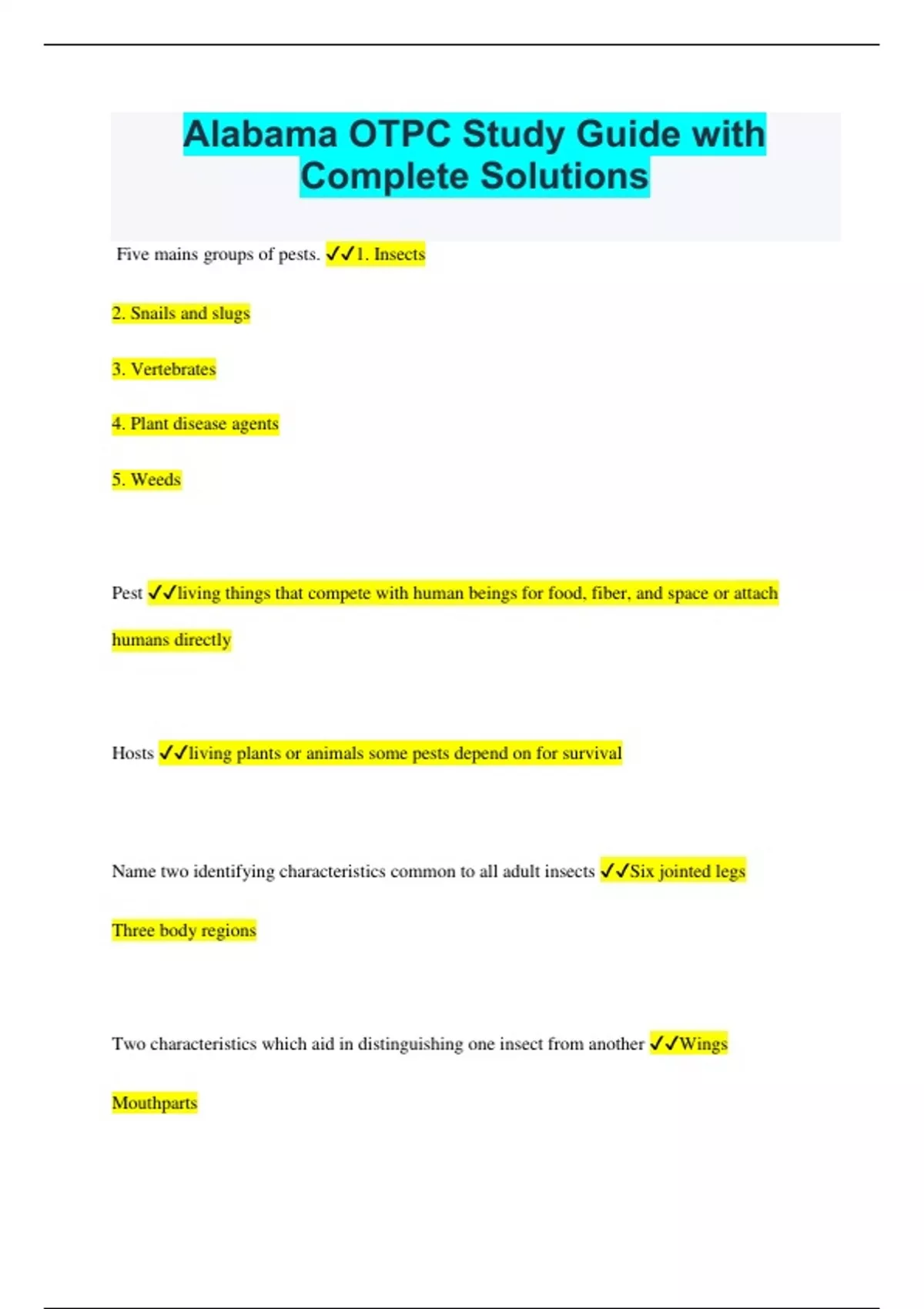 Alabama OTPC Study Guide with Complete Solutions Five mains groups of pests. 1. Insects 2. Snails and slugs 3. Vertebrates 4. Plant disease agents 5. Weeds Pest living things that compete with human beings for food, fiber, and space or attach humans directly Hosts living plants or animals some pests depend on for survival Name two identifying characteristics common to all adult insects Six jointed legs Three body regions Two characteristics which aid in distinguishing one insect from another Wings Mouthparts Explain the differences between the basic life cycles of insects Some change only in size as they develop Some change form slightly Some change completely in form and size Gradual Life Cycle Eggs - Nymph - Adult Also referred to "Simple" Complete Life Cycle Egg - Larva - Pupa - Adult Three characteristics of mites, ticks and spiders Eight jointed legs Two body regions Lack wings List four types of vertebrate animals that can be pests Fish Reptiles Amphibians Birds List types of living organisms that cause plant diseases Fungi Bacteria Viruses Nematodes List three main ways a plant responds to infection by a plant disease agent Overdevelopment of tissue Underdevelopment of tissue Death of tissue Define weeds Weeds are plants growing where thay are not wanted or in a way that is not desireable Characteristics of herbaceous grasses One leaf as the emerge Leaves narrow and upright; veins parallel Fibrous root system