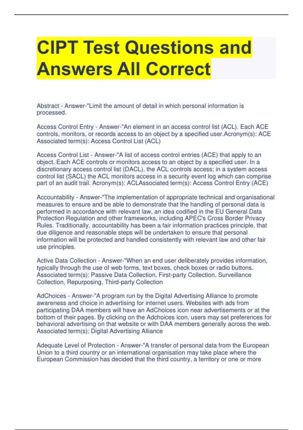 Abstract - Answer-"Limit the amount of detail in which personal information is processed. Access Control Entry - Answer-"An element in an access control list (ACL). Each ACE controls, monitors, or records access to an object by a specified user.Acronym(s): ACE Associated term(s): Access Control List (ACL) Access Control List - Answer-"A list of access control entries (ACE) that apply to an object. Each ACE controls or monitors access to an object by a specified user. In a discretionary access control list (DACL), the ACL controls access; in a system access control list (SACL) the ACL monitors access in a security event log which can comprise part of an audit trail. Acronym(s): ACLAssociated term(s): Access Control Entry (ACE) Accountability - Answer-"The implementation of appropriate technical and organisational measures to ensure and be able to demonstrate that the handling of personal data is performed in accordance with relevant law, an idea codified in the EU General Data Protection Regulation and other frameworks, including APEC's Cross Border Privacy Rules. Traditionally, accountability has been a fair information practices principle, that due diligence and reasonable steps will be undertaken to ensure that personal information will be protected and handled consistently with relevant law and other fair use principles. Active Data Collection - Answer-"When an end user deliberately provides information, typically through the use of web forms, text boxes, check boxes or radio buttons. Associated term(s): Passive Data Collection, First-party Collection, Surveillance Collection, Repurposing, Third-party Collection AdChoices - Answer-"A program run by the Digital Advertising Alliance to promote awareness and choice in advertising for internet users. Websites with ads from participating DAA members will have an AdChoices icon near advertisements or at the bottom of their pages. By clicking on the Adchoices icon, users may set preferences for behavioral advertising on that website or with DAA members generally across the web. Associated term(s): Digital Advertising Alliance Adequate Level of Protection - Answer-"A transfer of personal data from the European Union to a third country or an international organisation may take place where the European Commission has decided that the third country, a territory or one or more