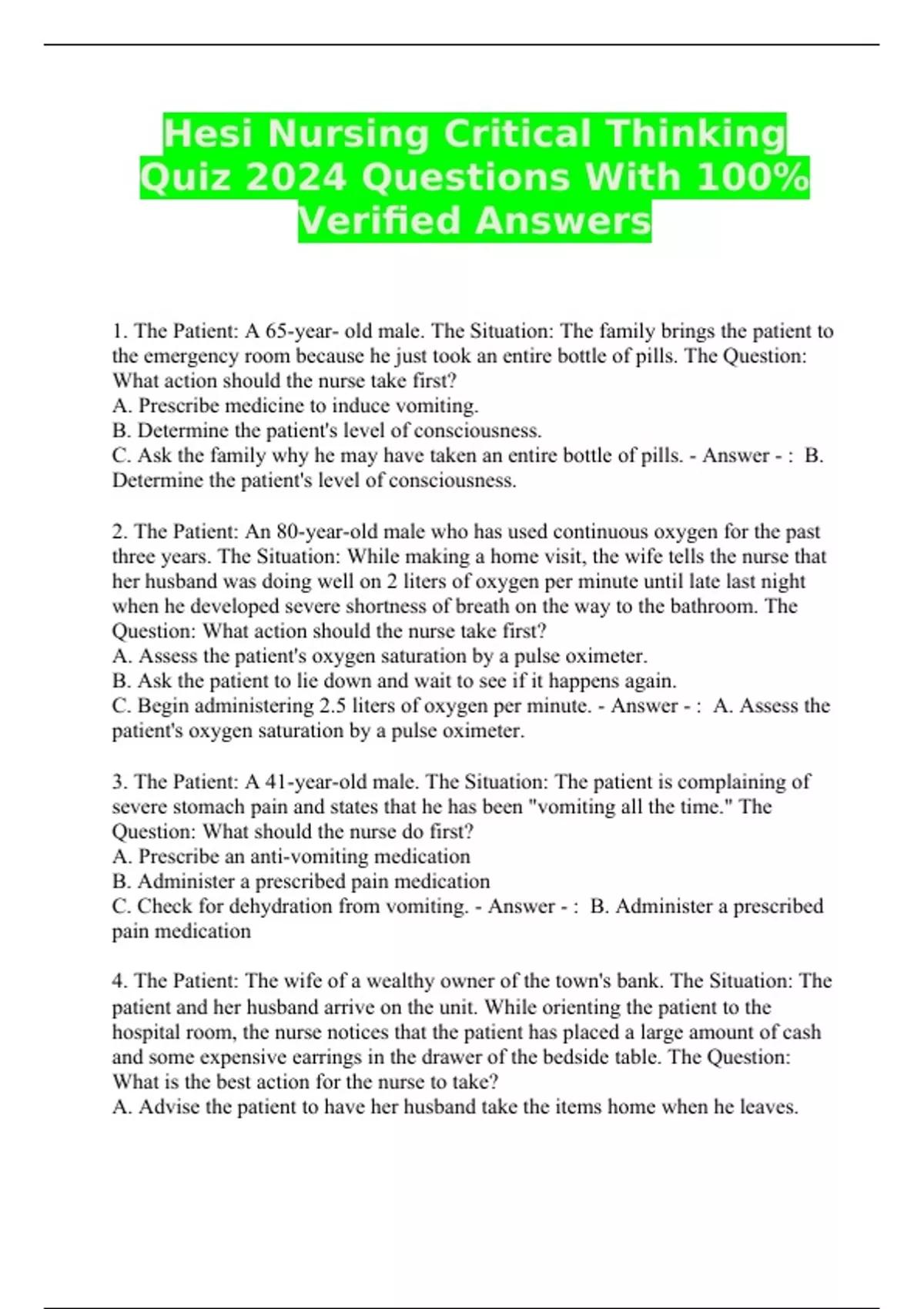 Hesi Nursing Critical Thinking Quiz 2024 Questions With 100% Verified Answers