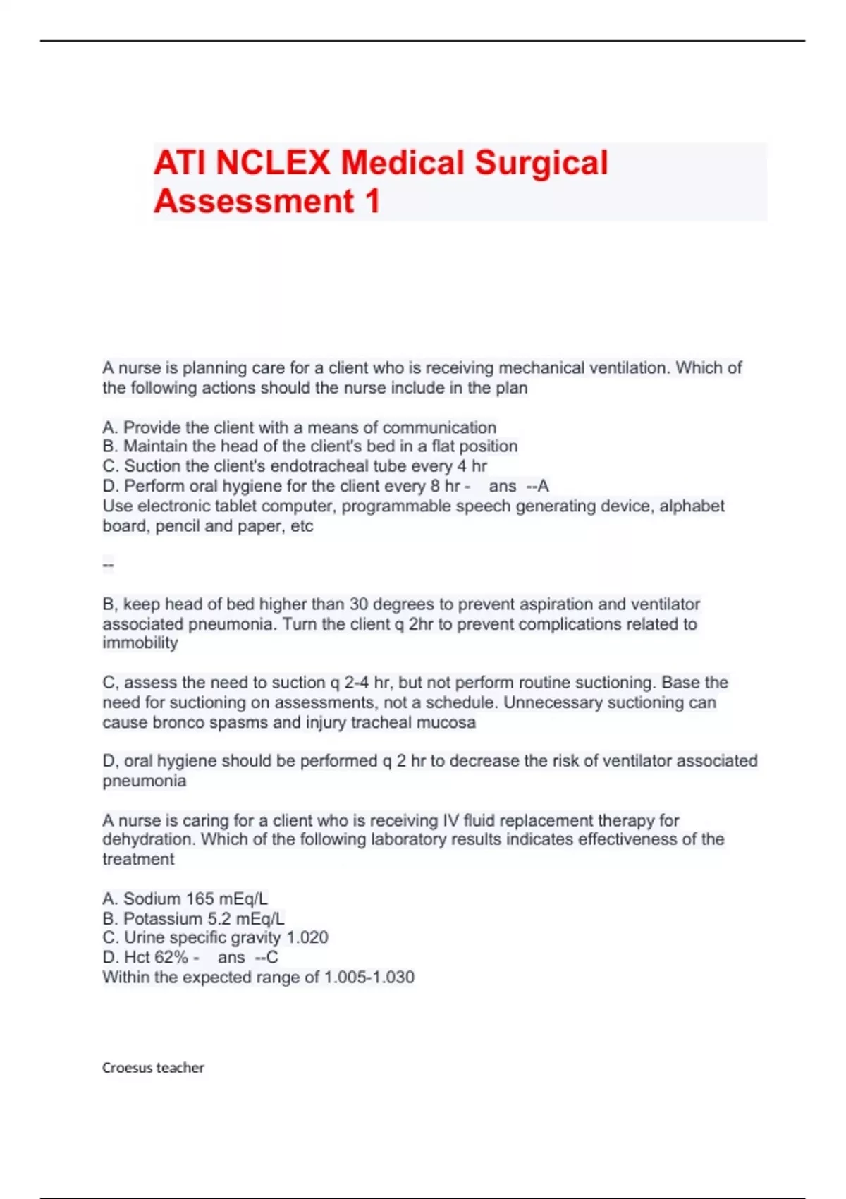 A nurse is planning care for a client who is receiving mechanical ventilation. Which of the following actions should the nurse include in the plan A. Provide the client with a means of communication B. Maintain the head of the client's bed in a flat position C. Suction the client's endotracheal tube every 4 hr D. Perform oral hygiene for the client every 8 hr - ans --A Use electronic tablet computer, programmable speech generating device, alphabet board, pencil and paper, etc -- B, keep head of bed higher than 30 degrees to prevent aspiration and ventilator associated pneumonia. Turn the client q 2hr to prevent complications related to immobility C, assess the need to suction q 2-4 hr, but not perform routine suctioning. Base the need for suctioning on assessments, not a schedule. Unnecessary suctioning can cause bronco spasms and injury tracheal mucosa D, oral hygiene should be performed q 2 hr to decrease the risk of ventilator associated pneumonia A nurse is caring for a client who is receiving IV fluid replacement therapy for dehydration. Which of the following laboratory results indicates effectiveness of the treatment A. Sodium 165 mEq/L B. Potassium 5.2 mEq/L C. Urine specific gravity 1.020 D. Hct 62% - ans --C Within the expected range of 1.005-1.030