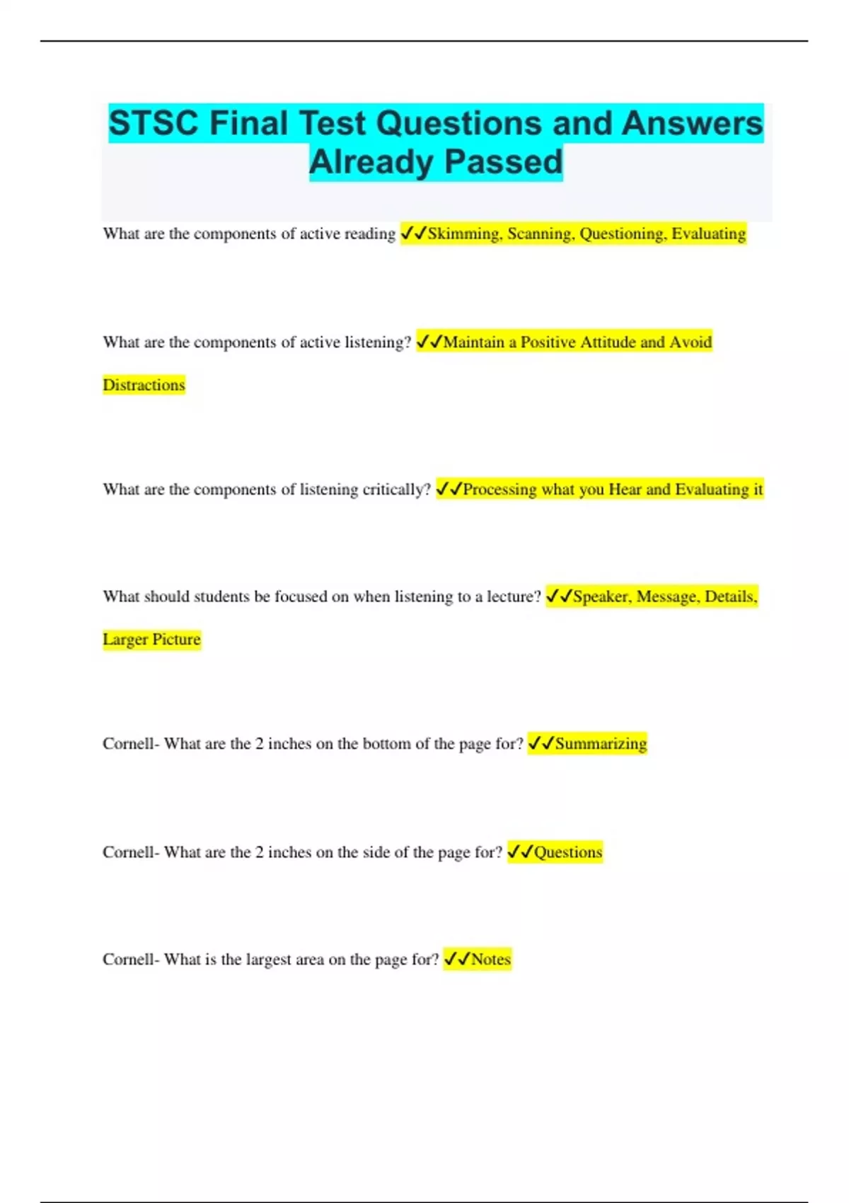 STSC Final Test Questions and Answers Already Passed What are the components of active reading Skimming, Scanning, Questioning, Evaluating What are the components of active listening? Maintain a Positive Attitude and Avoid Distractions What are the components of listening critically? Processing what you Hear and Evaluating it What should students be focused on when listening to a lecture? Speaker, Message, Details, Larger Picture Cornell- What are the 2 inches on the bottom of the page for? Summarizing Cornell- What are the 2 inches on the side of the page for? Questions Cornell- What is the largest area on the page for? Notes What are the benefits of The Cornell System? Organization Note Taking Guidelines Listening, Developing a Shorthand, Outlining, Annotating Shorthand Abbreviating Annotating Writing in the Margins of your Book What is the purpose of highlighting? Marking Important Words When should students review their notes? asap Chronological Details arranged in time Compare/Contrast Details arranged by similarities and differences Most Important/Least Important Details arranged in order of importance VARK Visual Aural Read/Write Kinesthetic What is VARK? A questionnaire that provides users with a profile of their learning preferences What are Mnemonic Devices? Memory Aids